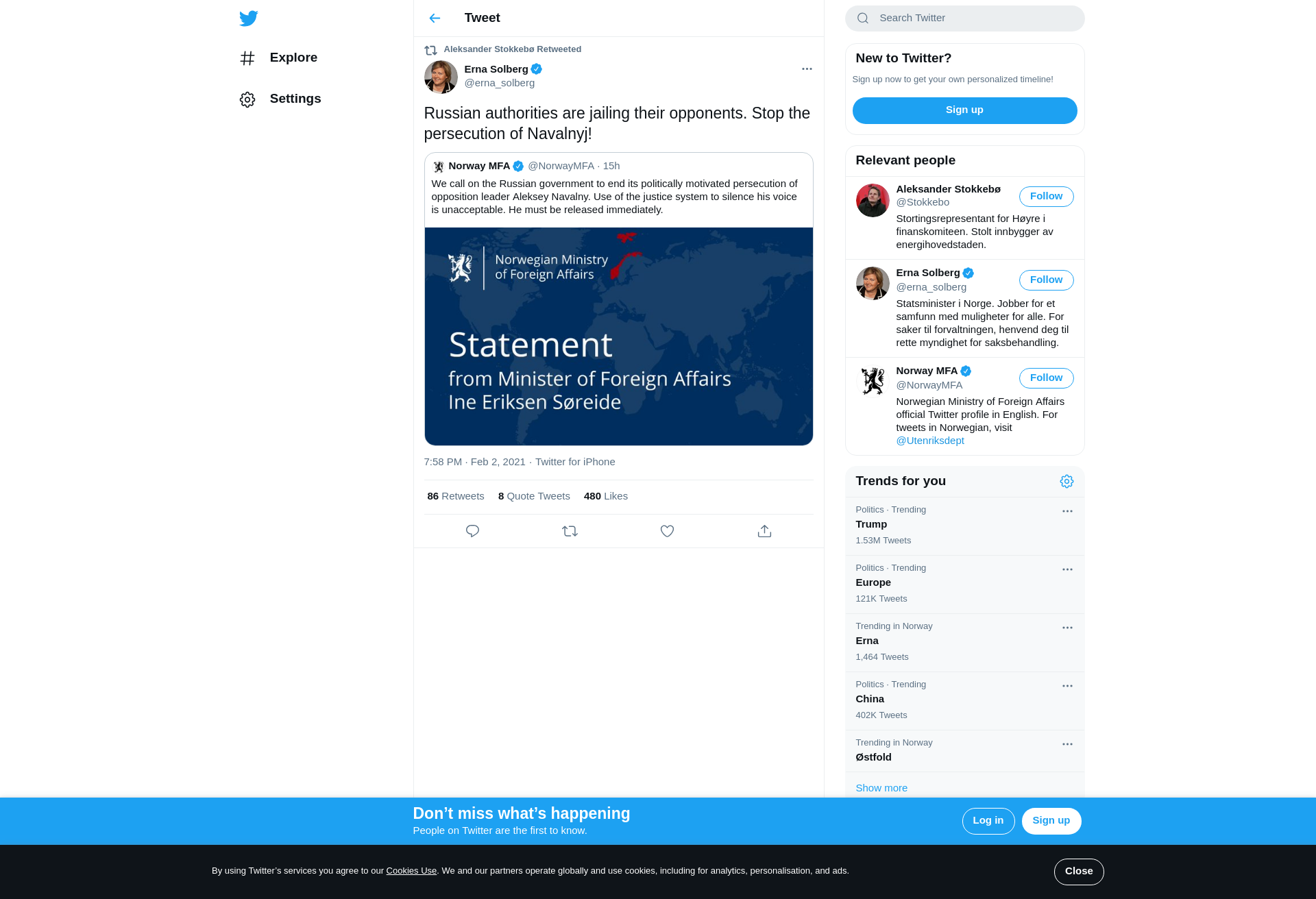 RT @erna_solberg: Russian authorities are jailing their opponents. Stop the persecution of Navalnyj!