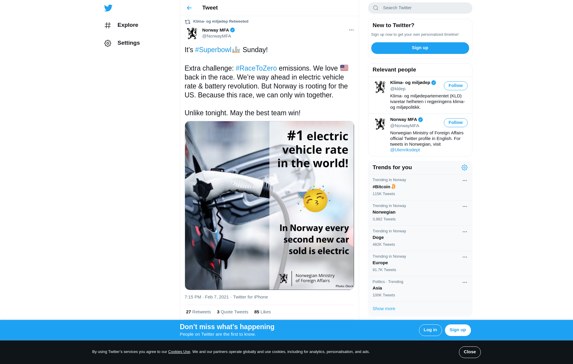 RT @NorwayMFA: It’s #Superbowl Sunday! Extra challenge: #RaceToZero emissions. We love 🇺🇸 back in the race. We’re way ahead in electric v…