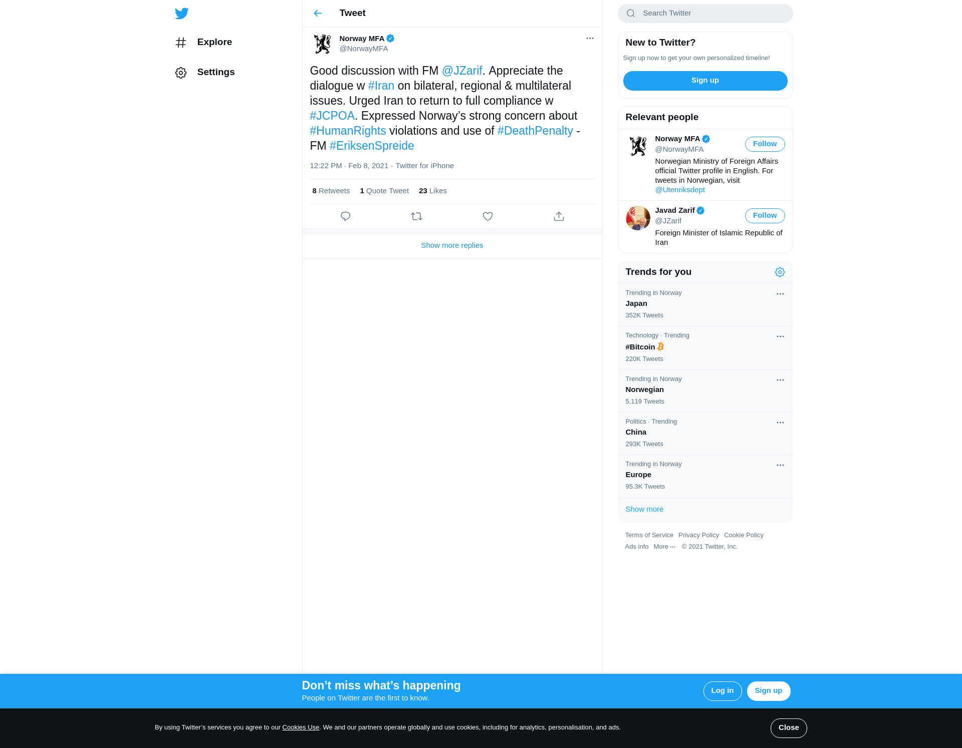 Good discussion with FM @JZarif. Appreciate the dialogue w #Iran on bilateral, regional & multilateral issues. Urged Iran to return to full compliance w #JCPOA. Expressed Norway’s strong concern about #HumanRights violations and use of #DeathPenalty - FM #EriksenSpreide