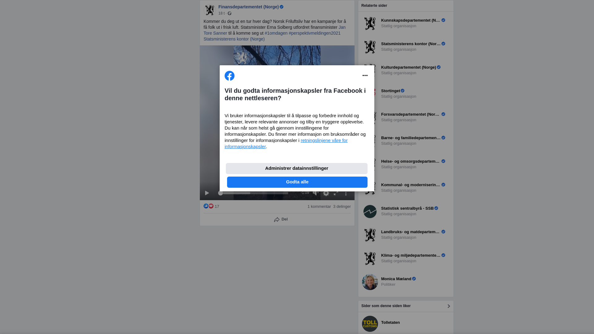 Kommer du deg ut en tur hver dag? Norsk Friluftsliv har en kampanje for å få folk ut i frisk luft. Statsminister Erna Solberg utfordret finansminister Jan Tore Sanner til å komme seg ut #1omdagen #perspektivmeldingen2021 Statsministerens kontor (Norge)
