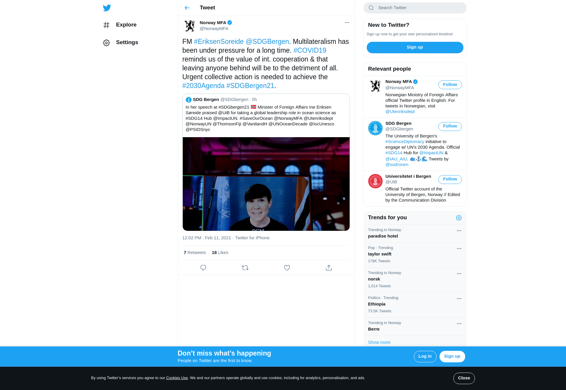 FM #EriksenSoreide @SDGBergen. Multilateralism has been under pressure for a long time. #COVID19 reminds us of the value of int. cooperation & that leaving anyone behind will be to the detriment of all. Urgent collective action is needed to achieve the #2030Agenda #SDGBergen21.