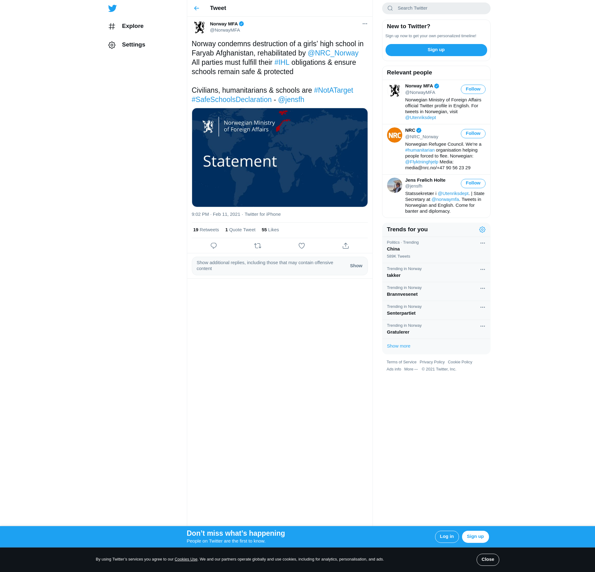Norway condemns destruction of a girls’ high school in Faryab Afghanistan, rehabilitated by @NRC_Norway All parties must fulfill their #IHL obligations & ensure schools remain safe & protected