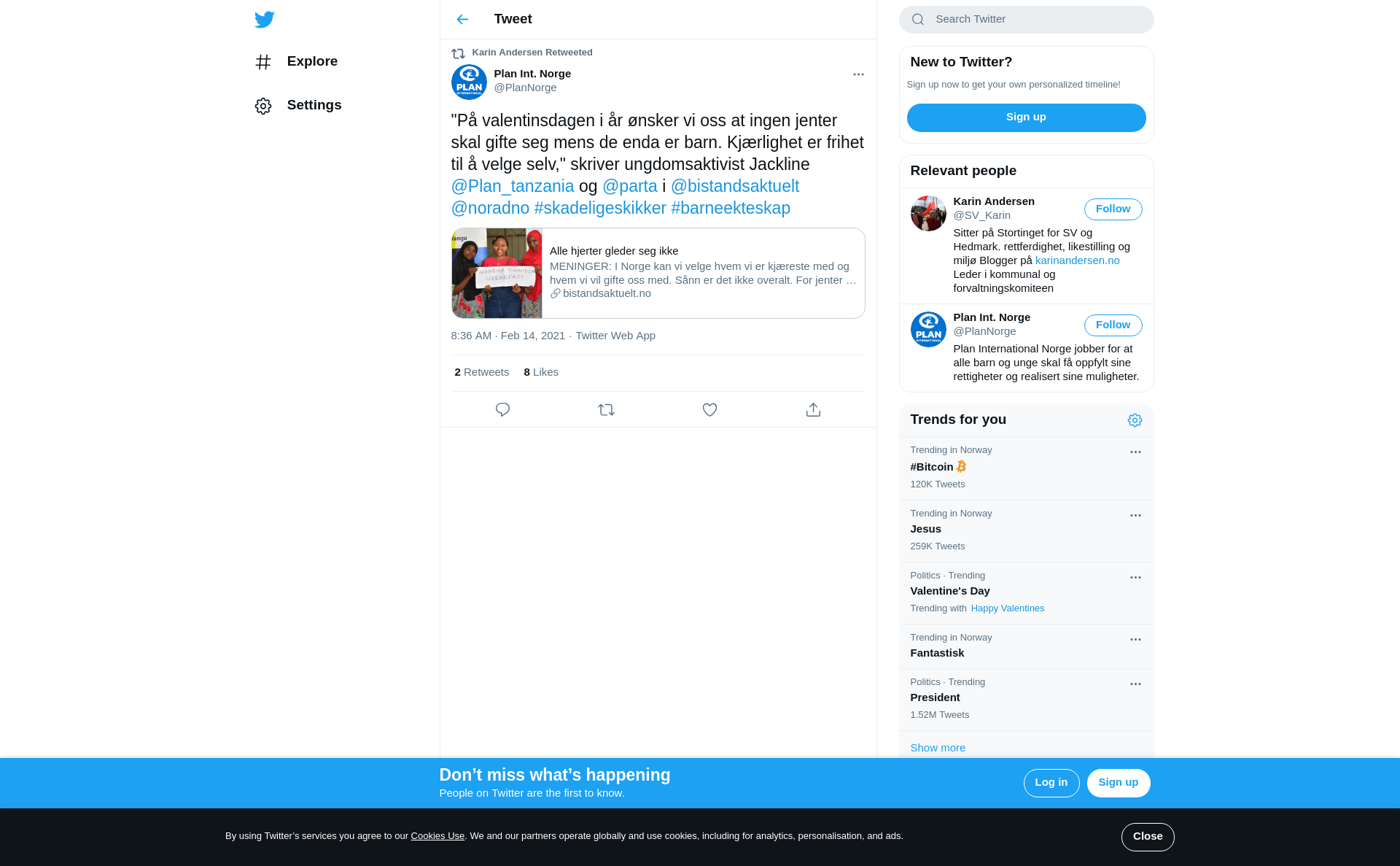 RT @PlanNorge: "På valentinsdagen i år ønsker vi oss at ingen jenter skal gifte seg mens de enda er barn. Kjærlighet er frihet til å velge selv," skriver ungdomsaktivist Jackline @Plan_tanzania og @parta i @bistandsaktuelt @noradno #skadeligeskikker #barneekteskap