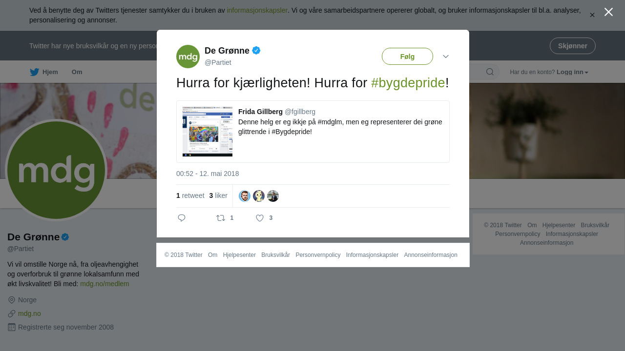 “Denne helg er eg ikkje på #mdglm, men eg representerer dei grøne glittrende i #Bygdepride!”