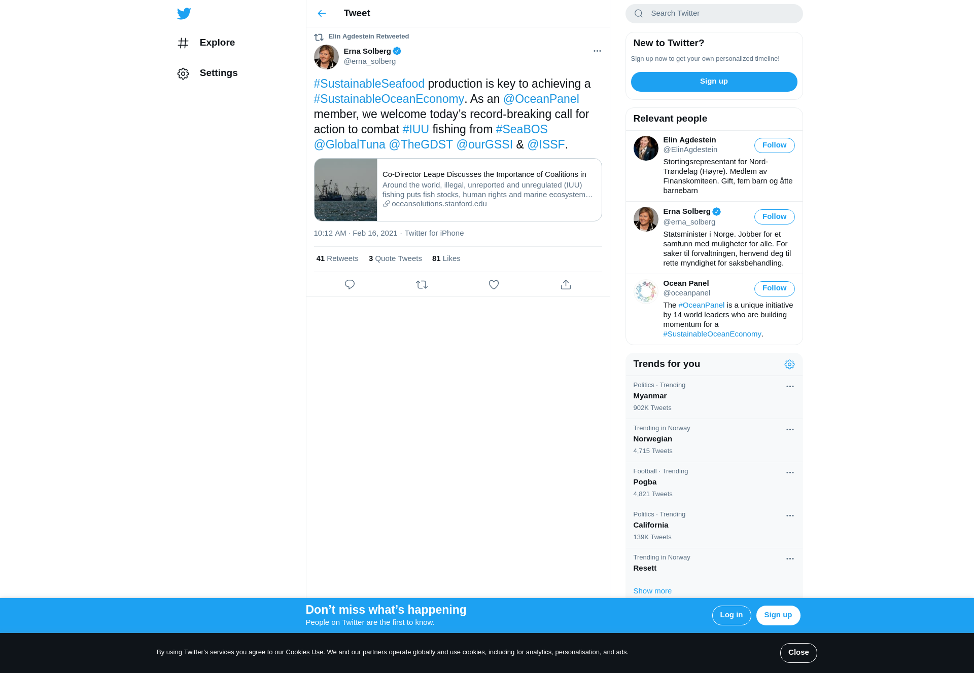RT @erna_solberg: #SustainableSeafood production is key to achieving a #SustainableOceanEconomy. As an @OceanPanel member, we welcome today’s record-breaking call for action to combat #IUU fishing from #SeaBOS @GlobalTuna @TheGDST @ourGSSI & @ISSF. https://t.co/MPugdAG2Wg