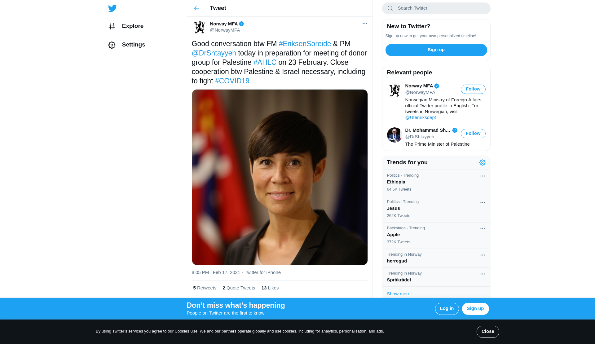 Good conversation btw FM #EriksenSoreide & PM @DrShtayyeh today in preparation for meeting of donor group for Palestine #AHLC on 23 February. Close cooperation btw Palestine & Israel necessary, including to fight #COVID19 https://t.co/aazA1194Zq