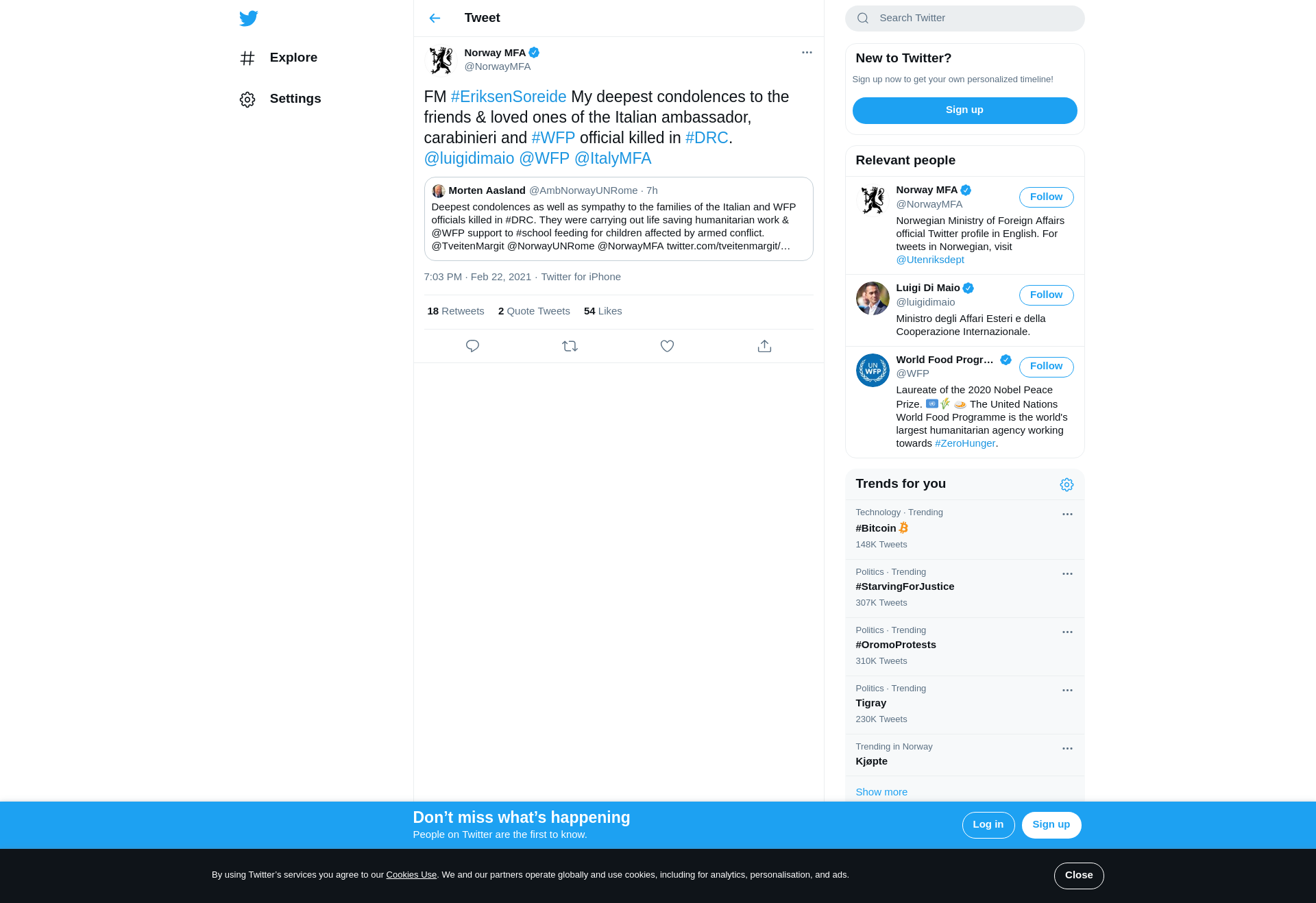 FM #EriksenSoreide My deepest condolences to the friends & loved ones of the Italian ambassador, carabinieri and #WFP official killed in #DRC. @luigidimaio @WFP @ItalyMFA