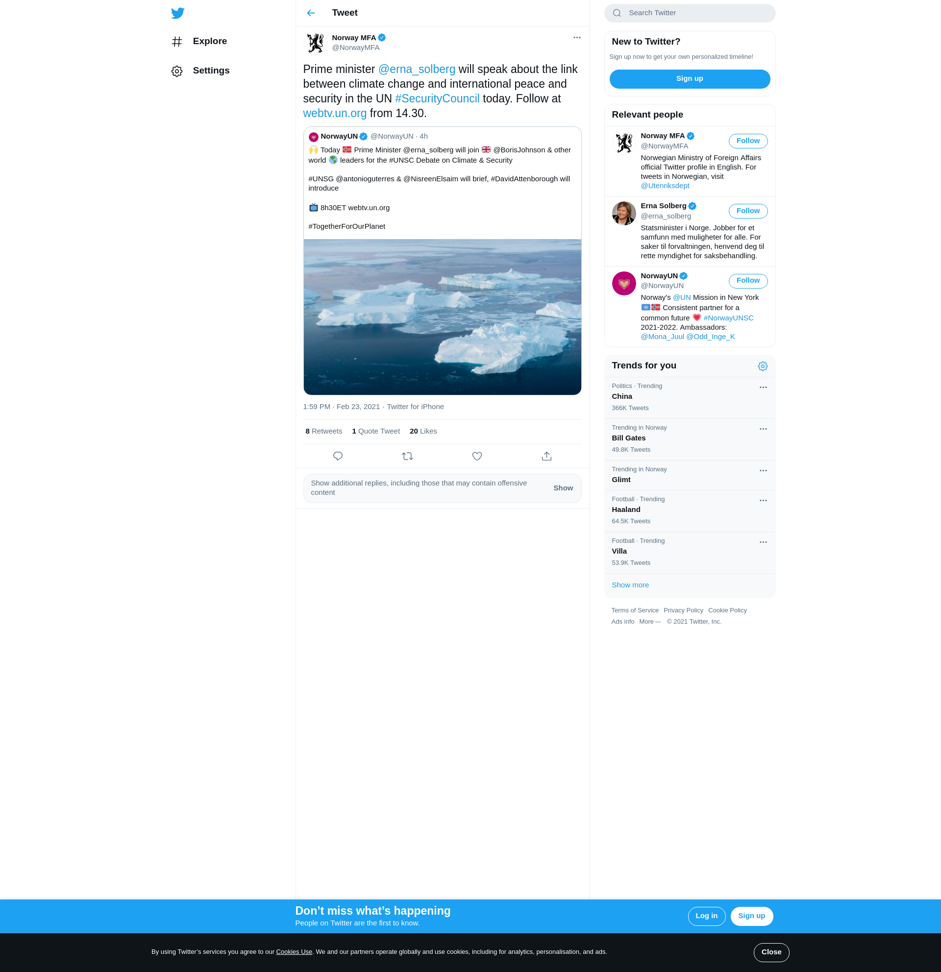 Prime minister @erna_solberg will speak about the link between climate change and international peace and security in the UN #SecurityCouncil today. Follow at https://t.co/NxnnKL6KeU from 14.30.