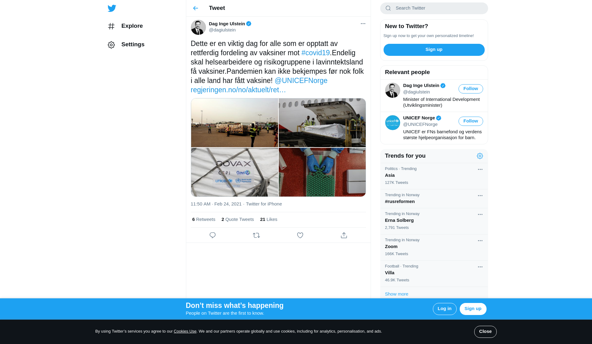 Dette er en viktig dag for alle som er opptatt av rettferdig fordeling av vaksiner mot #covid19.Endelig skal helsearbeidere og risikogruppene i lavinntektsland få vaksiner.Pandemien kan ikke bekjempes før nok folk i alle land har fått vaksine! @UNICEFNorge https://t.co/JYSQVnQN66 https://t.co/V4loLpMuWO