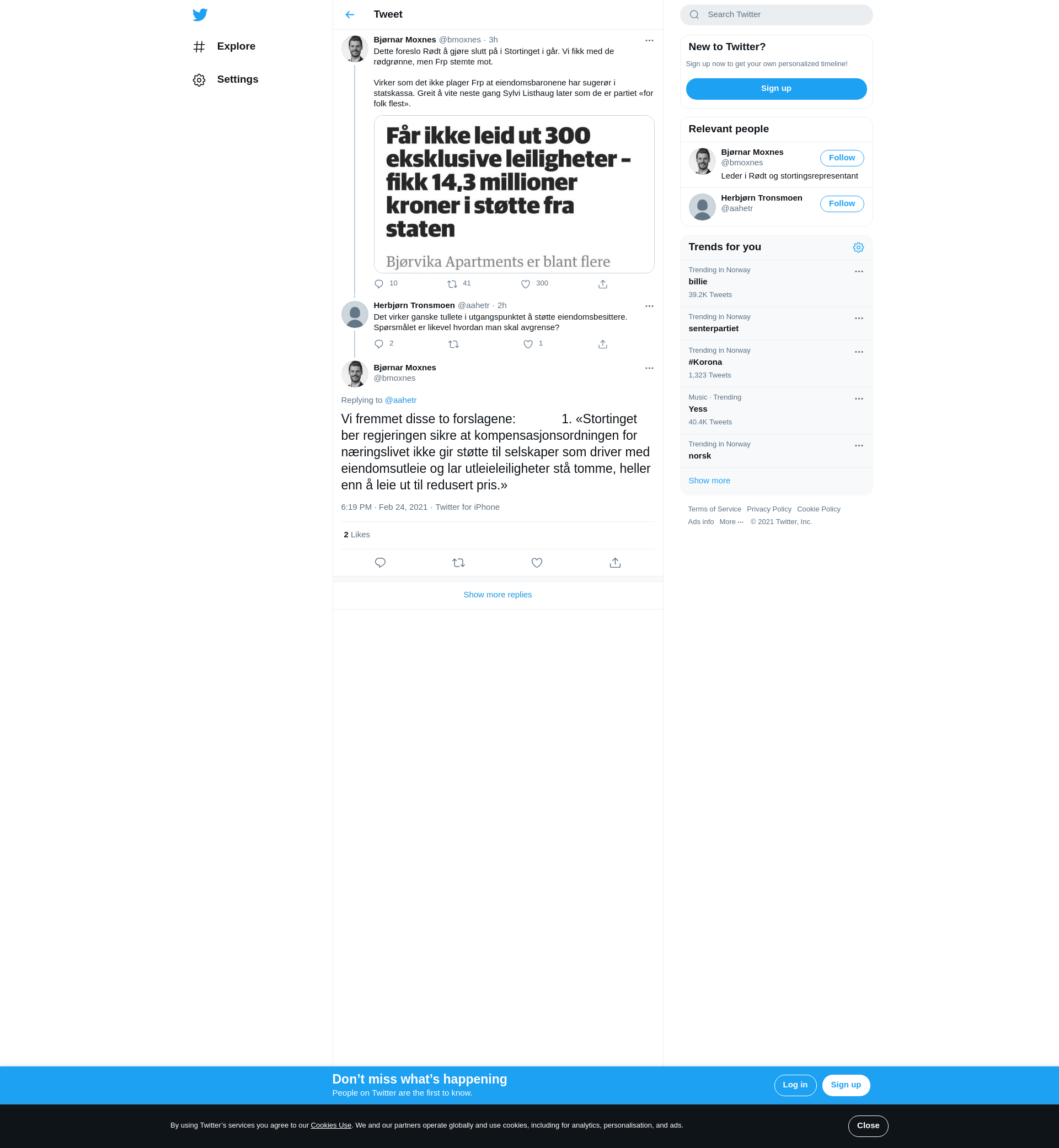 @aahetr Vi fremmet disse to forslagene: 1. «Stortinget ber regjeringen sikre at kompensasjonsordningen for næringslivet ikke gir støtte til selskaper som driver med eiendomsutleie og lar utleieleiligheter stå tomme, heller enn å leie ut til redusert pris.»