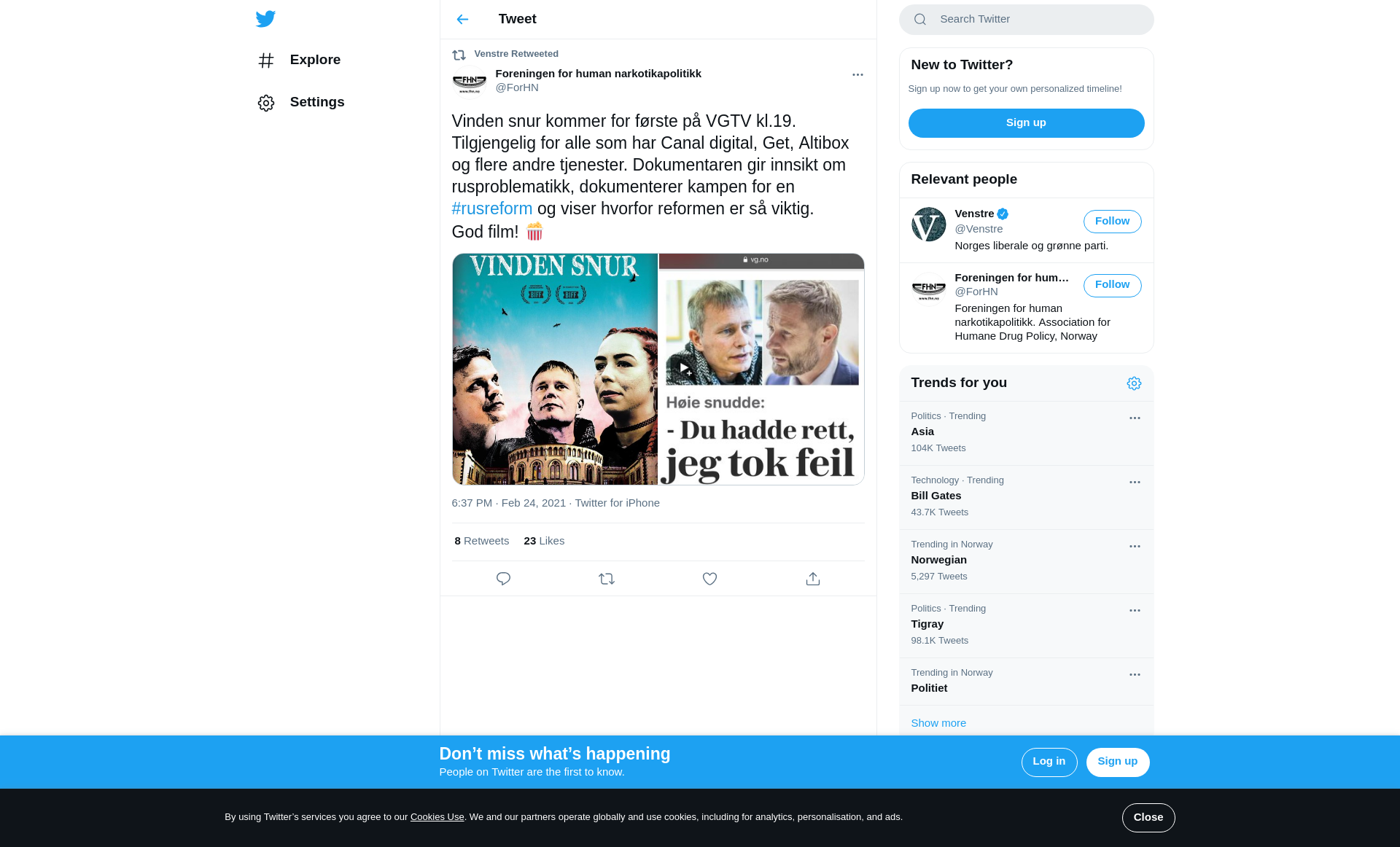 RT @ForHN: Vinden snur kommer for første på VGTV kl.19. Tilgjengelig for alle som har Canal digital, Get, Altibox og flere andre tjenester. Dokumentaren gir innsikt om rusproblematikk, dokumenterer kampen for en #rusreform og viser hvorfor reformen er så viktig.