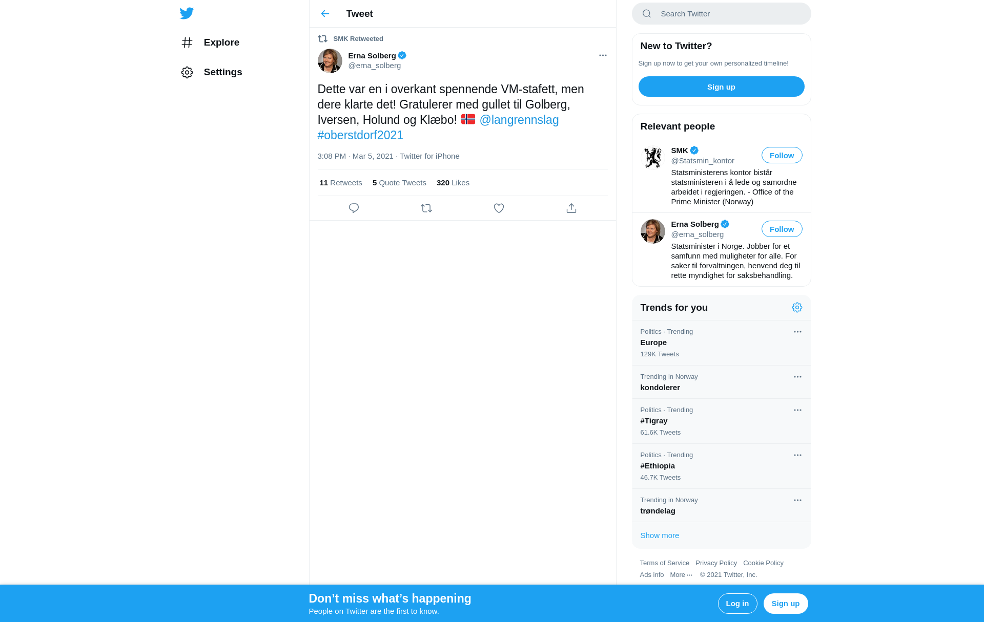 RT @erna_solberg: Dette var en i overkant spennende VM-stafett, men dere klarte det! Gratulerer med gullet til Golberg, Iversen, Holund og Klæbo! 🇳🇴 @langrennslag #oberstdorf2021