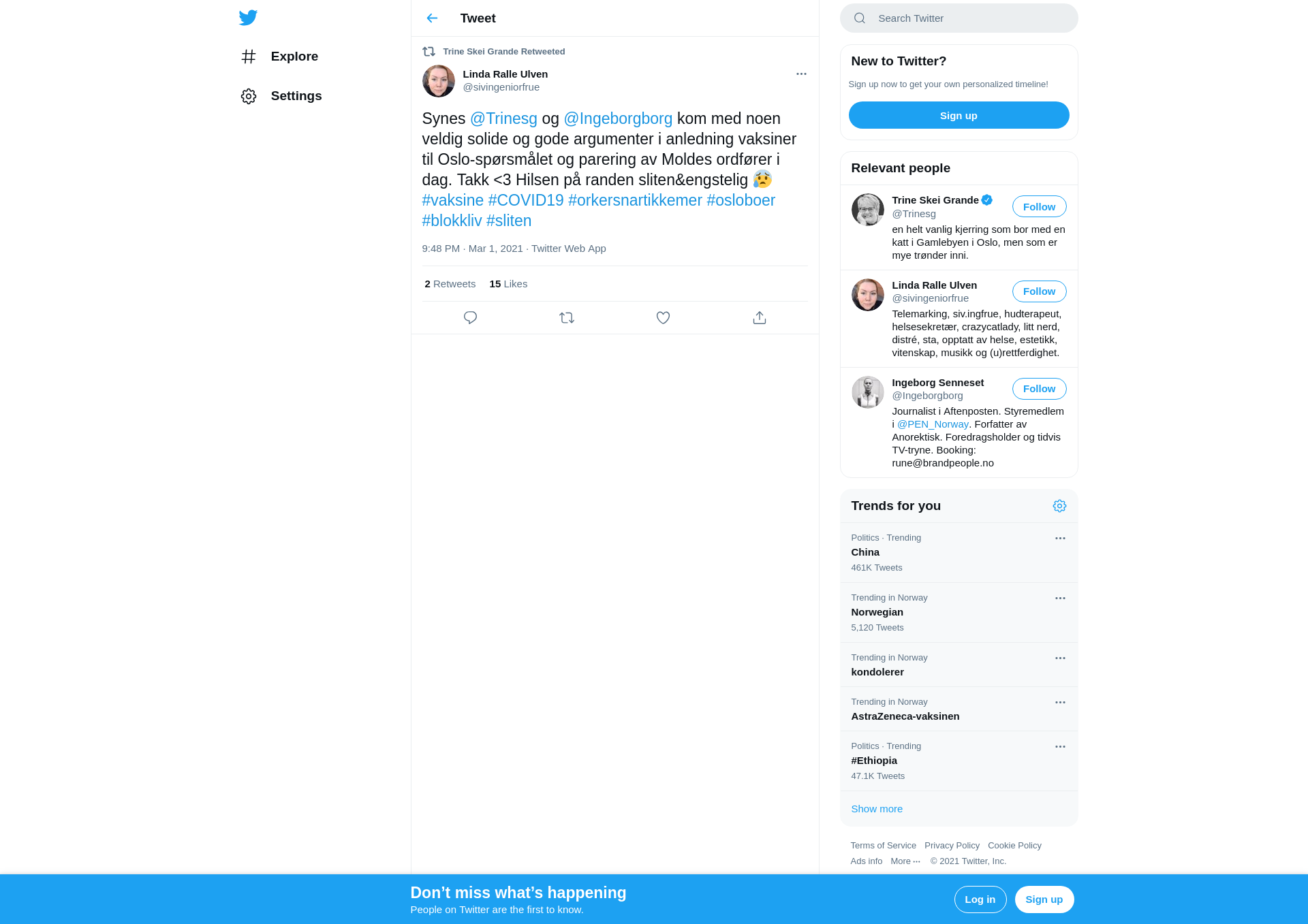 RT @sivingeniorfrue: Synes @Trinesg og @Ingeborgborg kom med noen veldig solide og gode argumenter i anledning vaksiner til Oslo-spørsmålet og parering av Moldes ordfører i dag. Takk <3 Hilsen på randen sliten&engstelig 😰 #vaksine #COVID19 #orkersnartikkemer #osloboer #blokkliv #sliten