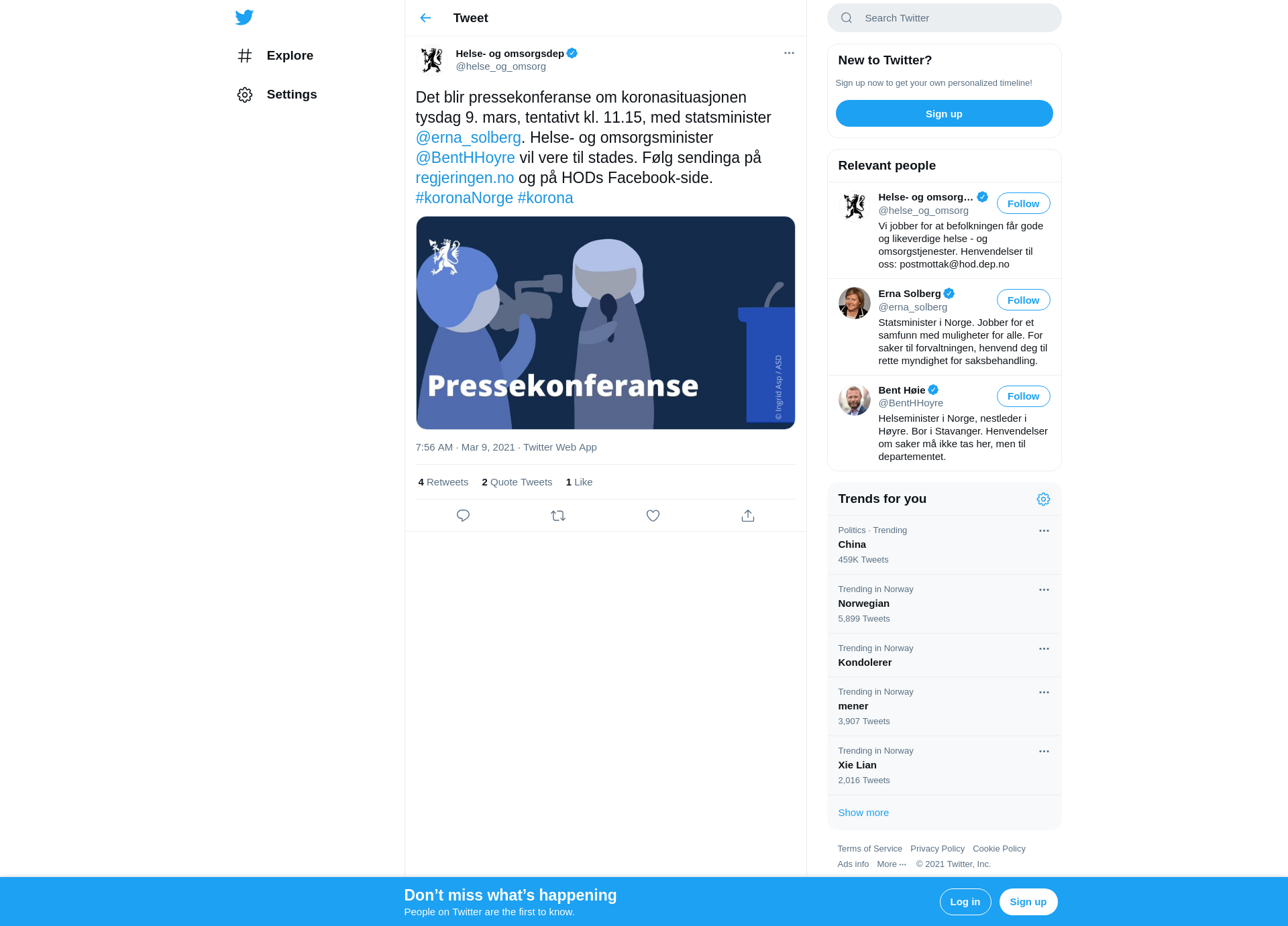 Det blir pressekonferanse om koronasituasjonen tysdag 9. mars, tentativt kl. 11.15, med statsminister @erna_solberg. Helse- og omsorgsminister @BentHHoyre vil vere til stades. Følg sendinga på https://t.co/hF6MQdjqWr og på HODs Facebook-side. #koronaNorge #korona https://t.co/fcwT2W6l4e
