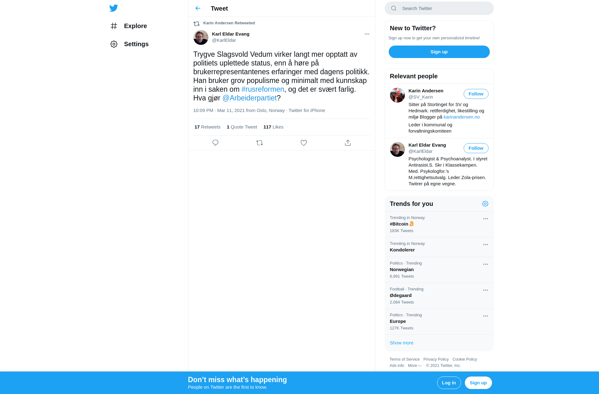 RT @KarlEldar: Trygve Slagsvold Vedum virker langt mer opptatt av politiets uplettede status, enn å høre på brukerrepresentantenes erfaringer med dagens politikk. Han bruker grov populisme og minimalt med kunnskap inn i saken om #rusreformen, og det er svært farlig. Hva gjør @Arbeiderpartiet?