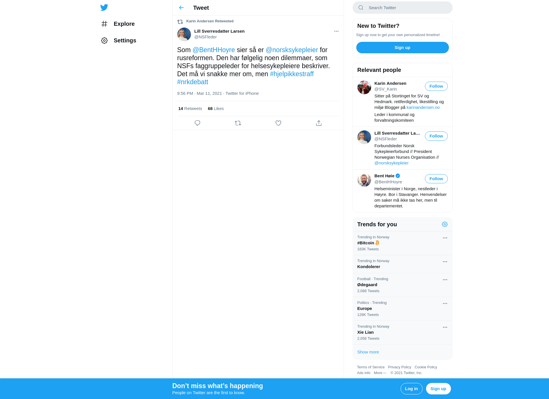 RT @NSFleder: Som @BentHHoyre sier så er @norsksykepleier for rusreformen. Den har følgelig noen dilemmaer, som NSFs faggruppeleder for helsesykepleiere beskriver. Det må vi snakke mer om, men #hjelpikkestraff #nrkdebatt