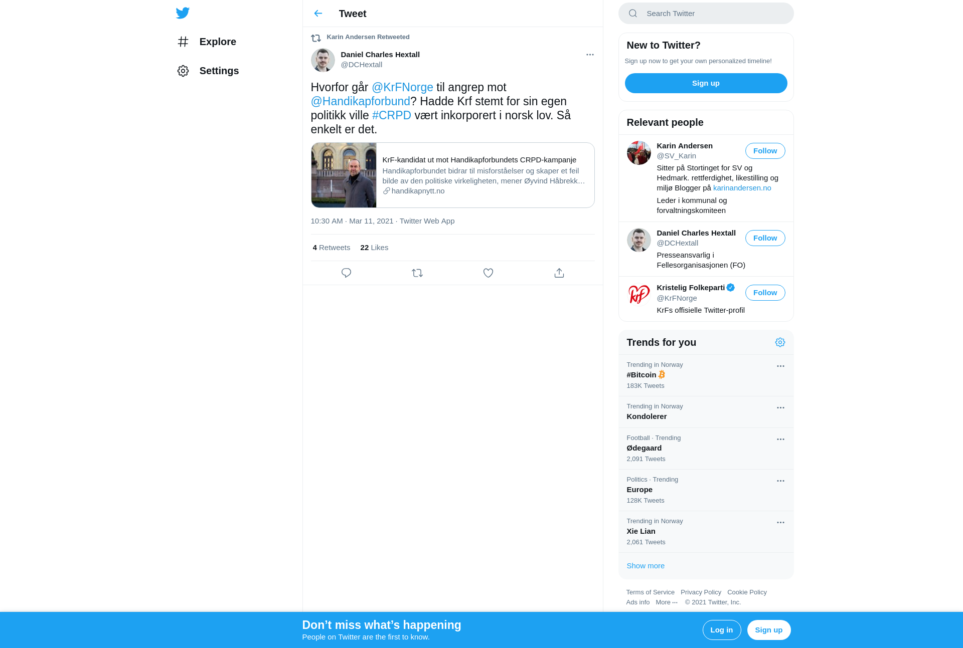 RT @DCHextall: Hvorfor går @KrFNorge til angrep mot @Handikapforbund? Hadde Krf stemt for sin egen politikk ville #CRPD vært inkorporert i norsk lov. Så enkelt er det. https://t.co/zow9fgYHYr