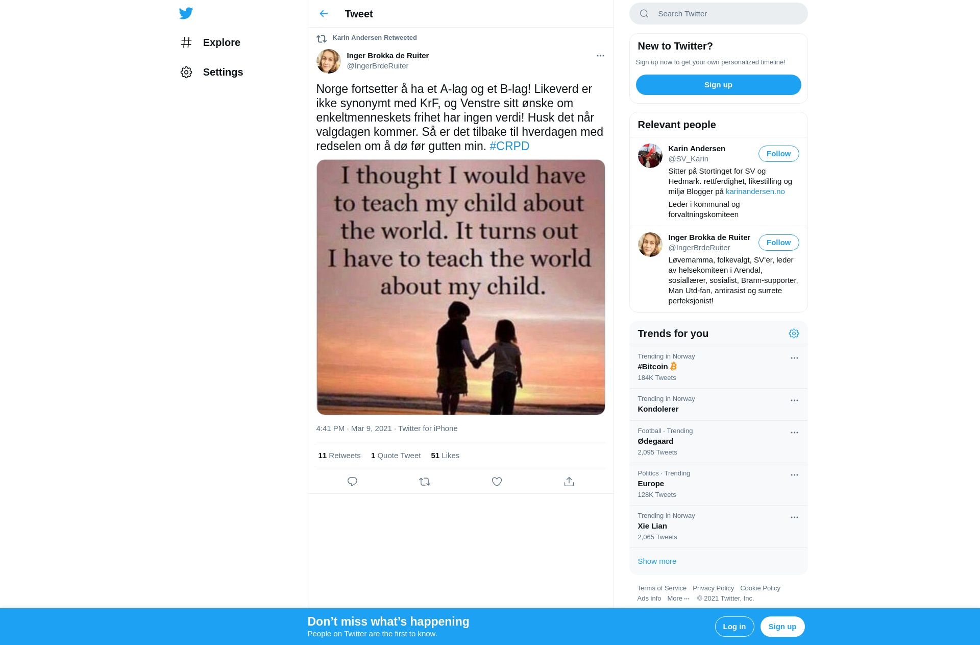 RT @IngerBrdeRuiter: Norge fortsetter å ha et A-lag og et B-lag! Likeverd er ikke synonymt med KrF, og Venstre sitt ønske om enkeltmenneskets frihet har ingen verdi! Husk det når valgdagen kommer. Så er det tilbake til hverdagen med redselen om å dø før gutten min. #CRPD https://t.co/FkGmlEIjBX