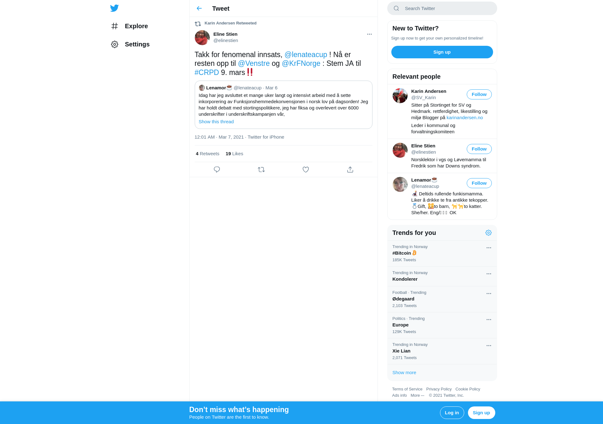 RT @elinestien: Takk for fenomenal innsats, @lenateacup ! Nå er resten opp til @Venstre og @KrFNorge : Stem JA til #CRPD 9. mars‼️