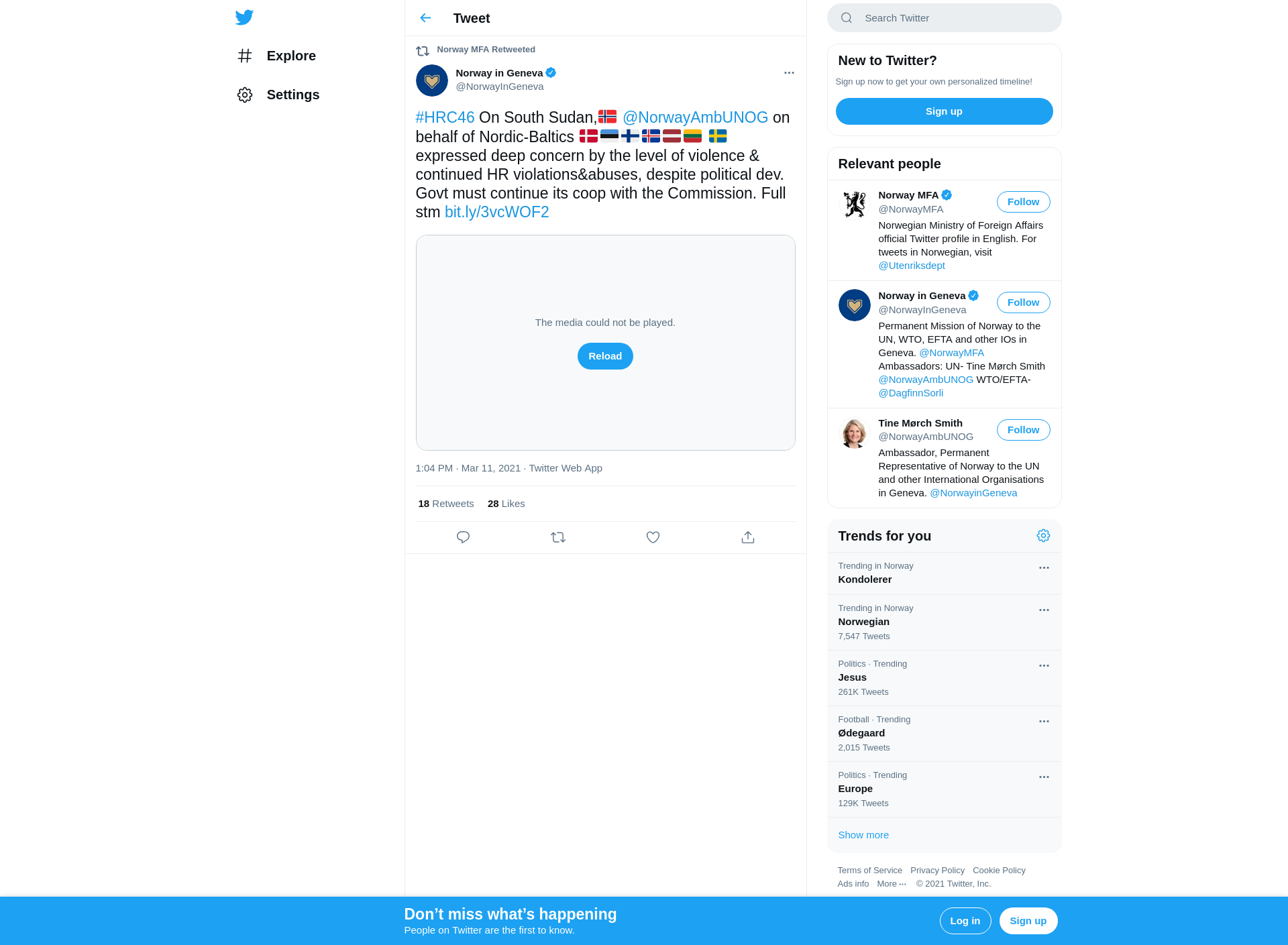 RT @NorwayInGeneva: #HRC46 On South Sudan,🇳🇴 @NorwayAmbUNOG on behalf of Nordic-Baltics 🇩🇰🇪🇪🇫🇮🇮🇸🇱🇻🇱🇹 🇸🇪 expressed deep concern by the level of violence & continued HR violations&abuses, despite political dev. Govt must continue its coop with the Commission. Full stm https://t.co/yzYjygCf3n https://t.co/GNLRzqu6YL