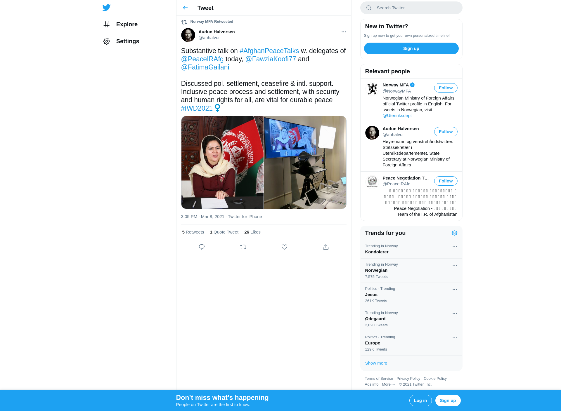 RT @auhalvor: Substantive talk on #AfghanPeaceTalks w. delegates of @PeaceIRAfg today, @FawziaKoofi77 and @FatimaGailani Discussed pol. s…