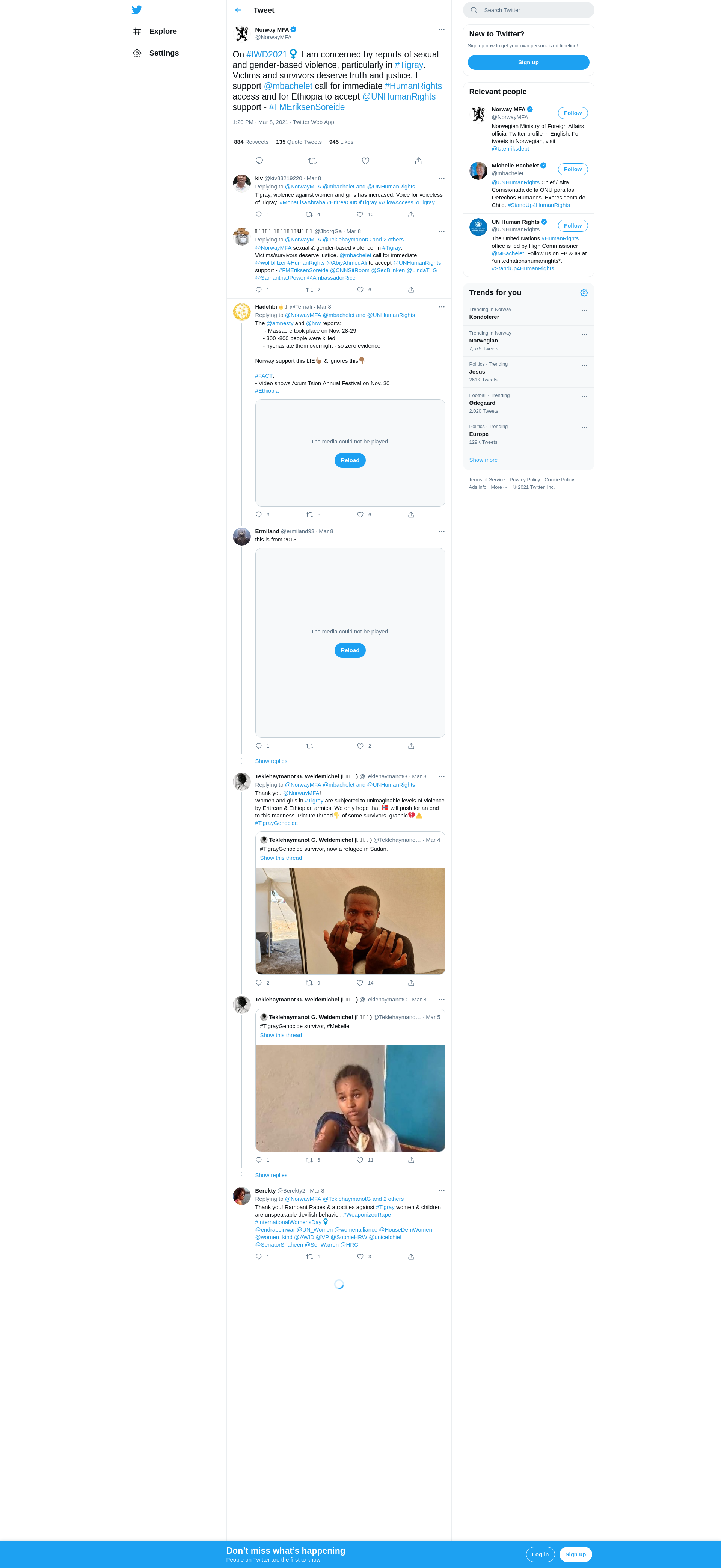 On #IWD2021 I am concerned by reports of sexual and gender-based violence, particularly in #Tigray. Victims and survivors deserve truth and justice. I support @mbachelet call for immediate #HumanRights access and for Ethiopia to accept @UNHumanRights support - #FMEriksenSoreide