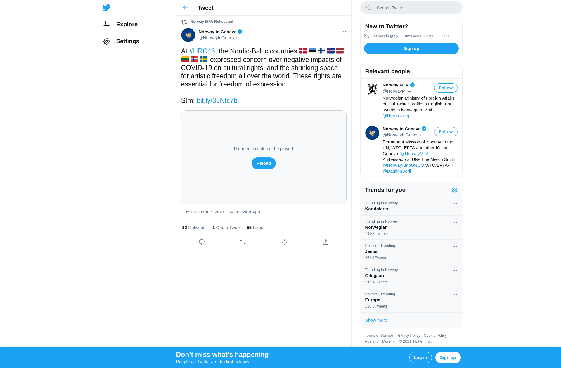 RT @NorwayInGeneva: At #HRC46, the Nordic-Baltic countries 🇩🇰🇪🇪🇫🇮🇮🇸🇱🇻🇱🇹🇳🇴🇸🇪 expressed concern over negative impacts of COVID-19 on cultural rights, and the shrinking space for artistic freedom all over the world. These rights are essential for freedom of expression.