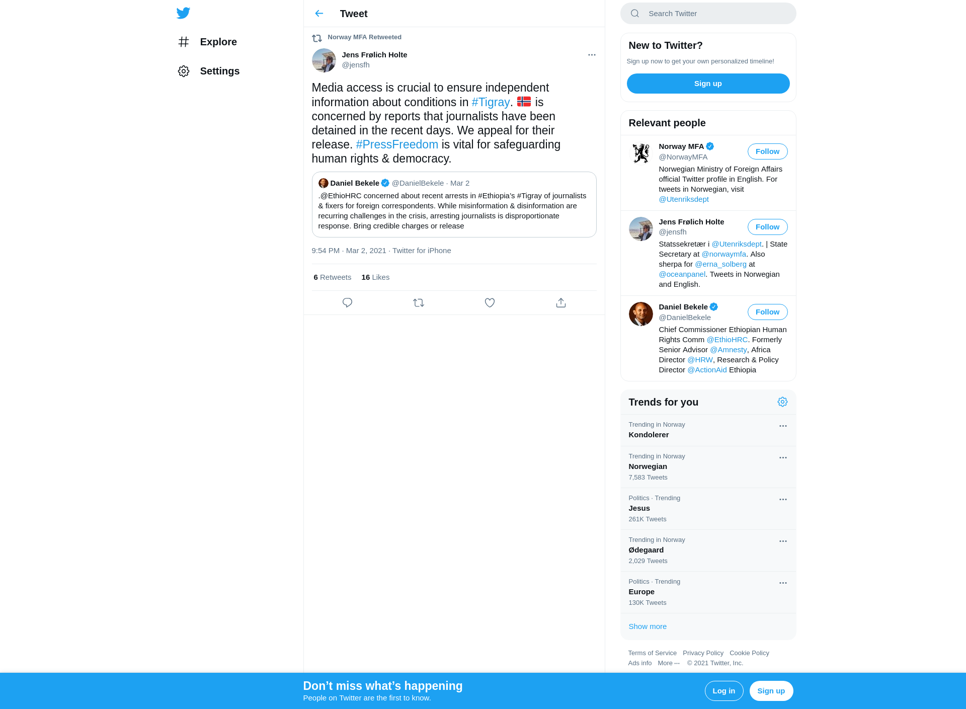RT @jensfh: Media access is crucial to ensure independent information about conditions in #Tigray. 🇳🇴 is concerned by reports that journalists have been detained in the recent days. We appeal for their release. #PressFreedom is vital for safeguarding human rights & democracy. https://t.co/uK7AMXRnbK