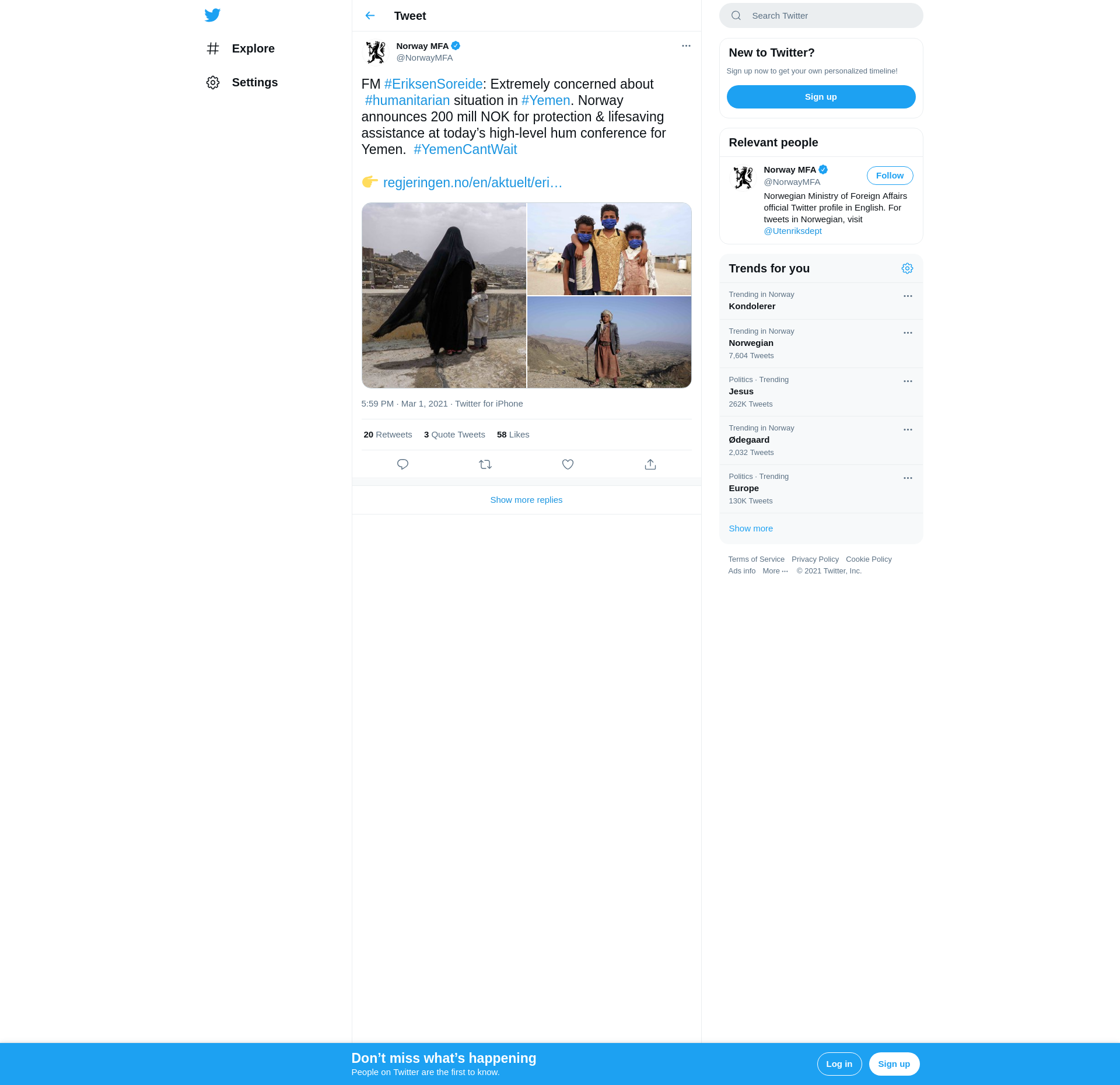 ‘After six years of armed conflict, the civilian population of Yemen is now facing the worst humanitarian crisis in the world. I am deeply concerned about the situation. At the High-Level Pledging Event for the Humanitarian Crisis in Yemen today, Norwa...