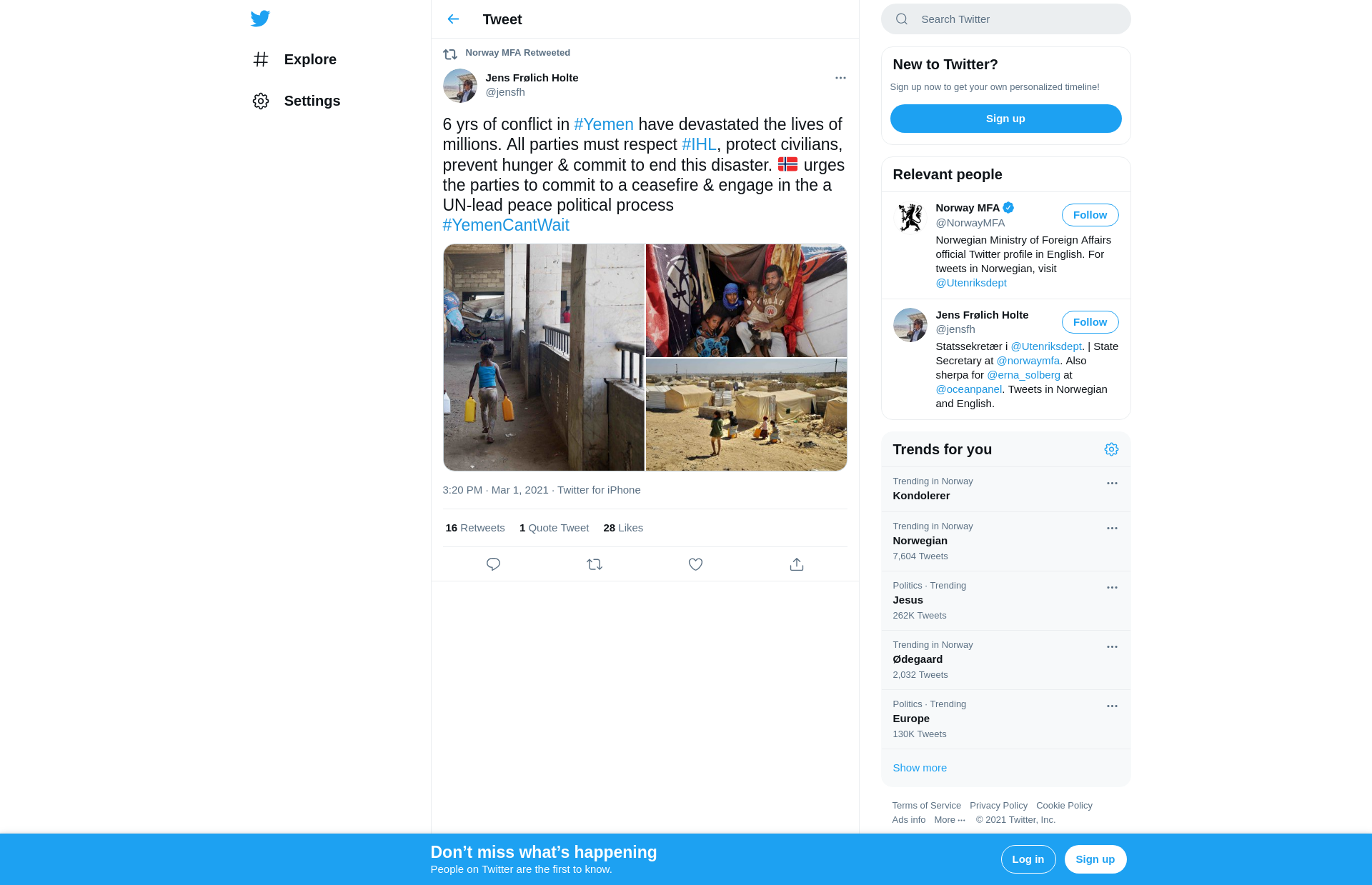 RT @jensfh: 6 yrs of conflict in #Yemen have devastated the lives of millions. All parties must respect #IHL, protect civilians, prevent hunger & commit to end this disaster. 🇳🇴 urges the parties to commit to a ceasefire & engage in the a UN-lead peace political process