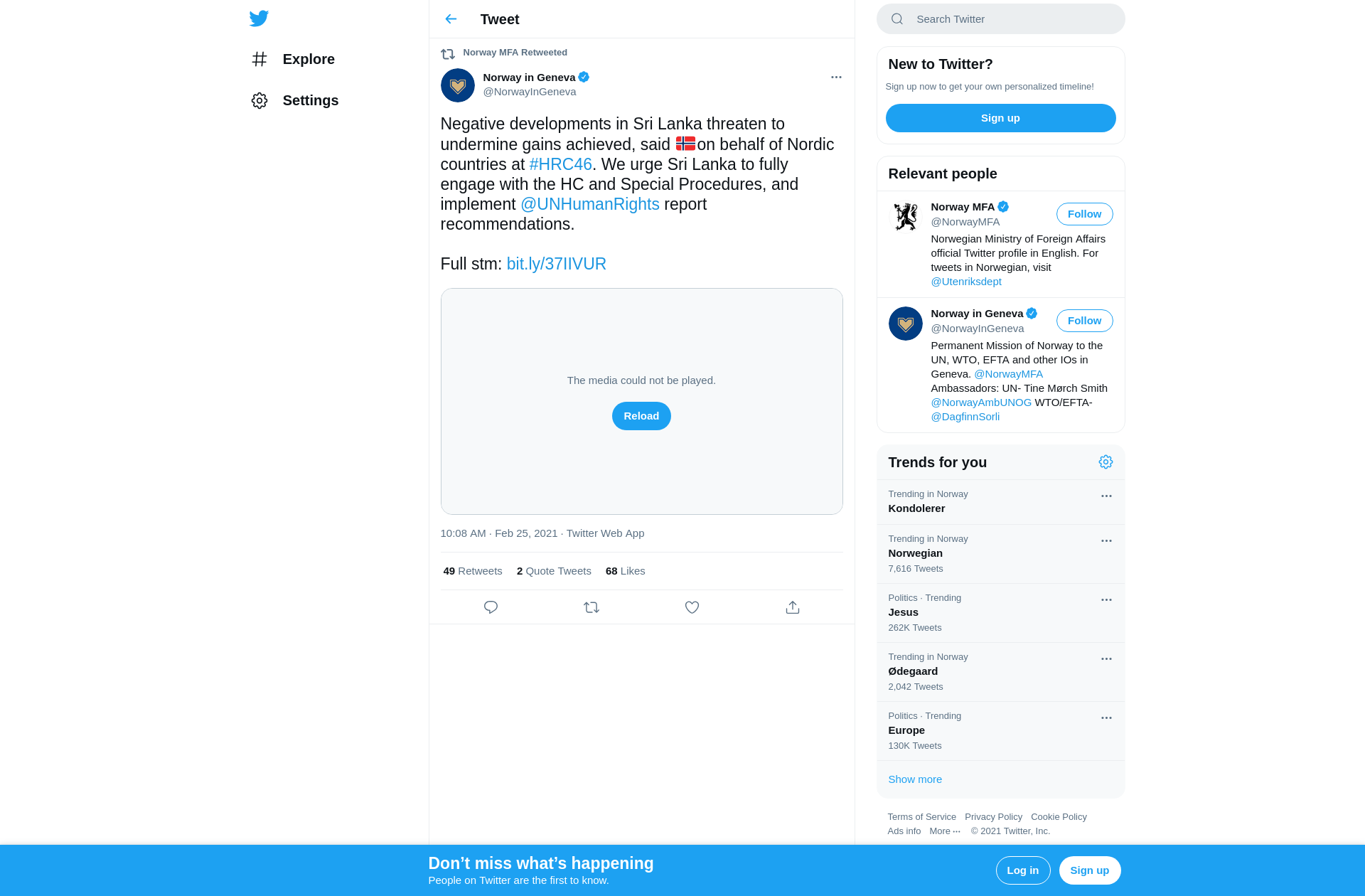 RT @NorwayInGeneva: Negative developments in Sri Lanka threaten to undermine gains achieved, said 🇳🇴on behalf of Nordic countries at #HRC46. We urge Sri Lanka to fully engage with the HC and Special Procedures, and implement @UNHumanRights report recommendations.