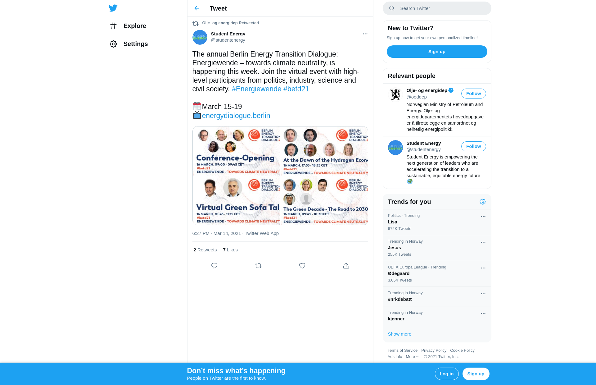 RT @studentenergy: The annual Berlin Energy Transition Dialogue: Energiewende – towards climate neutrality, is happening this week. Join the virtual event with high-level participants from politics, industry, science and civil society. #Energiewende #betd21