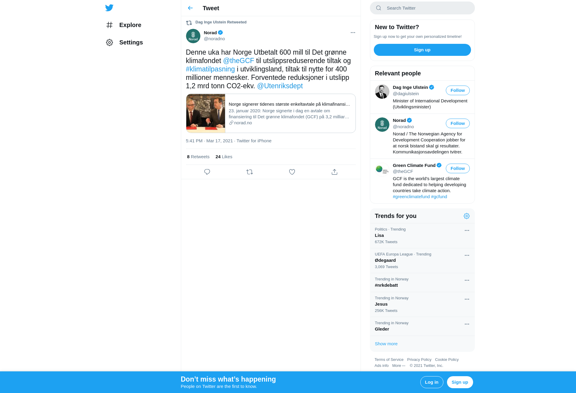 RT @noradno: Denne uka har Norge Utbetalt 600 mill til Det grønne klimafondet @theGCF til utslippsreduserende tiltak og #klimatilpasning i utviklingsland, tiltak til nytte for 400 millioner mennesker. Forventede reduksjoner i utslipp 1,2 mrd tonn CO2-ekv. @Utenriksdept https://t.co/wBfFuDYpZV
