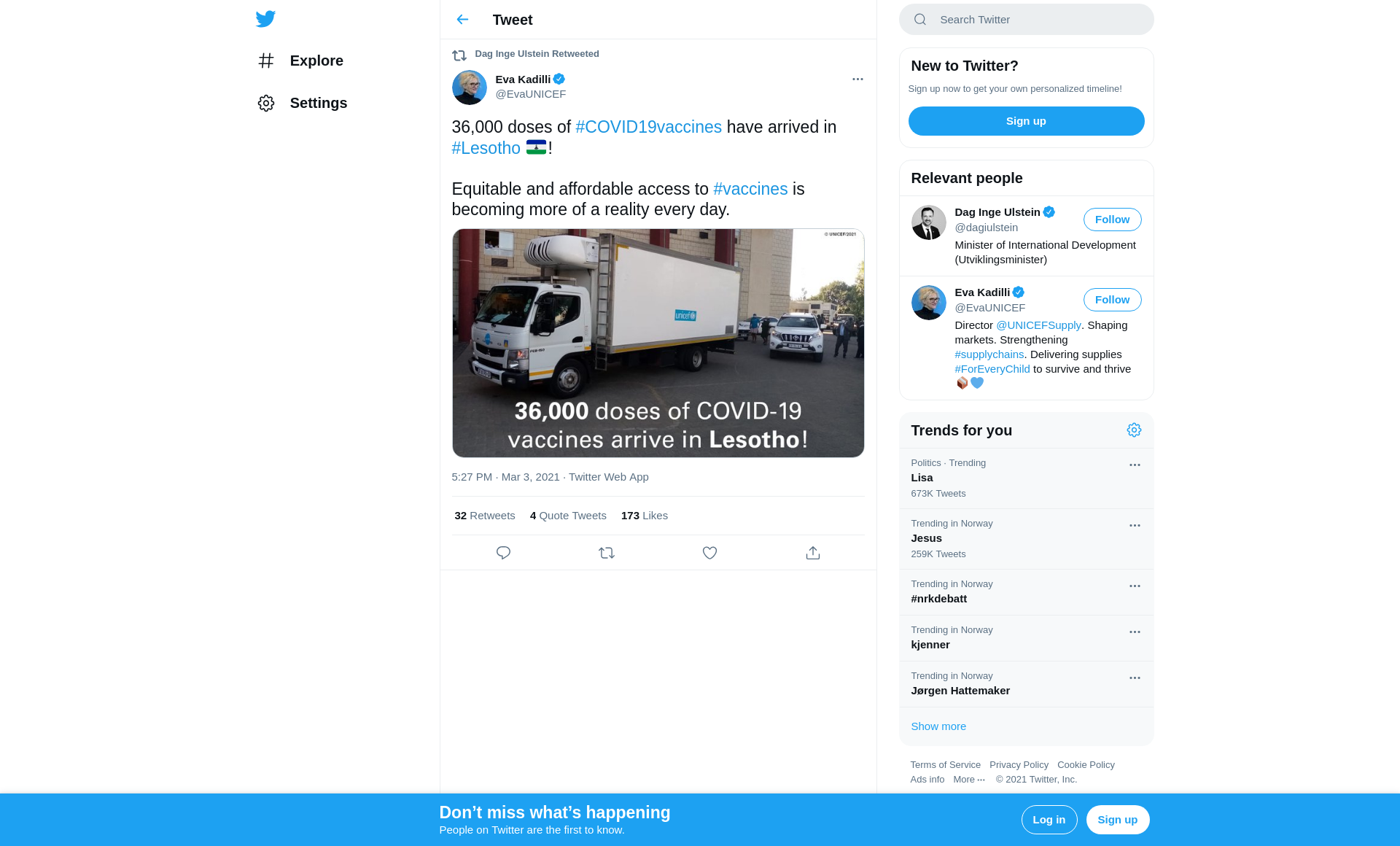 RT @EvaUNICEF: 36,000 doses of #COVID19vaccines have arrived in #Lesotho 🇱🇸! Equitable and affordable access to #vaccines is becoming mor…