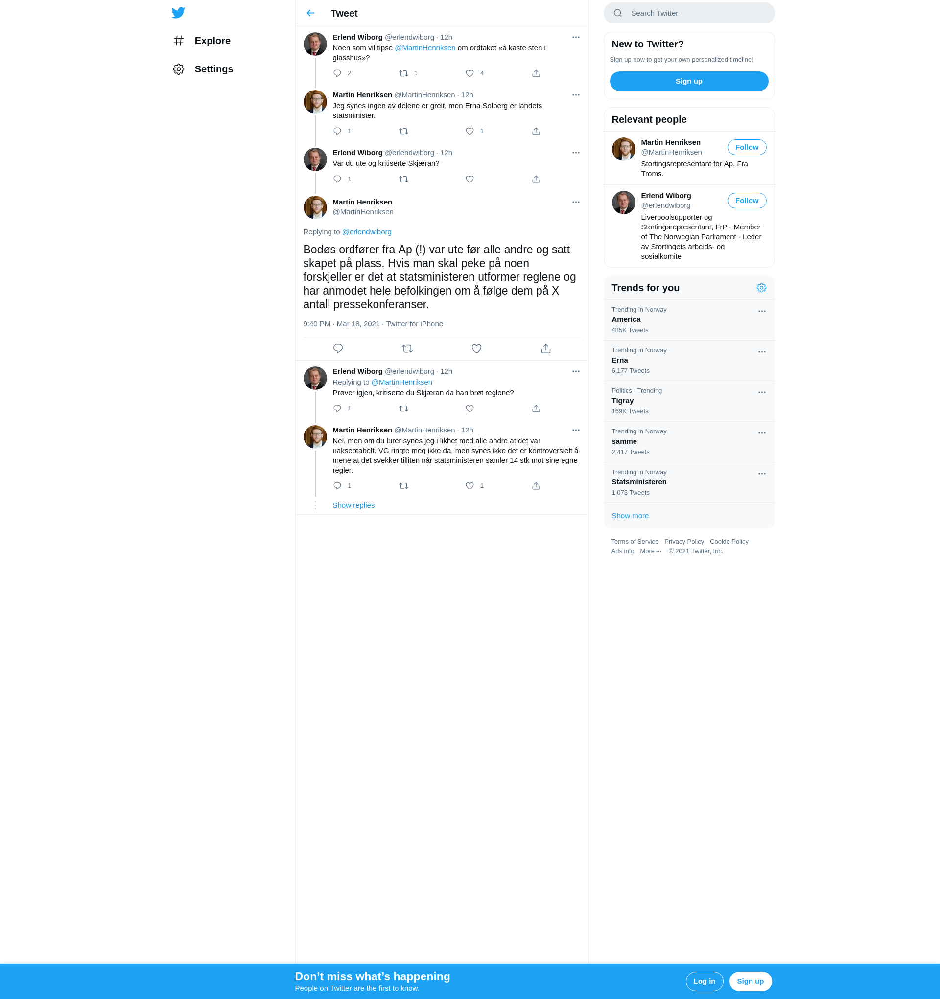 @erlendwiborg Bodøs ordfører fra Ap (!) var ute før alle andre og satt skapet på plass. Hvis man skal peke på noen forskjeller er det at statsministeren utformer reglene og har anmodet hele befolkingen om å følge dem på X antall pressekonferanser.