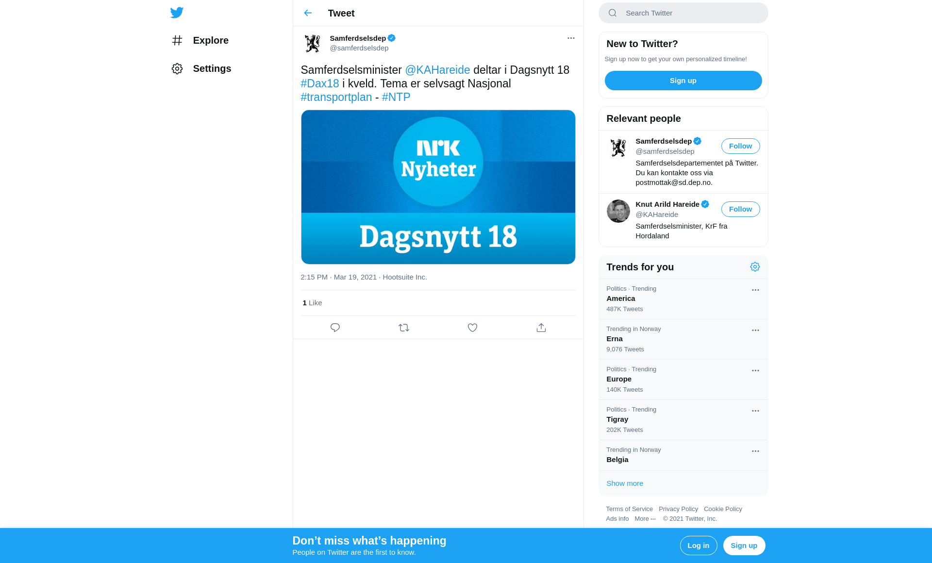 Samferdselsminister @KAHareide deltar i Dagsnytt 18 #Dax18 i kveld. Tema er selvsagt Nasjonal #transportplan - #NTP https://t.co/1PW5CgfHhD