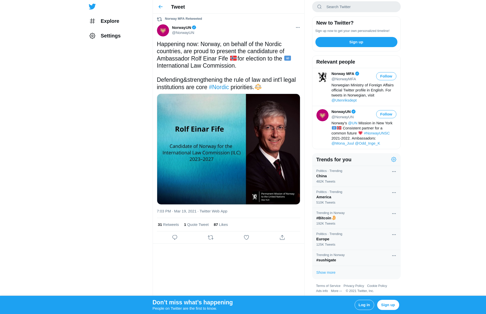 RT @NorwayUN: Happening now: Norway, on behalf of the Nordic countries, are proud to present the candidature of Ambassador Rolf Einar Fife 🇳🇴for election to the 🇺🇳 International Law Commission.
