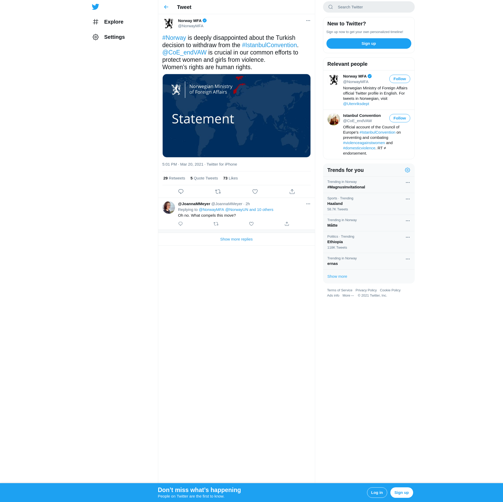 #Norway is deeply disappointed about the Turkish decision to withdraw from the #IstanbulConvention. @CoE_endVAW is crucial in our common efforts to protect women and girls from violence.