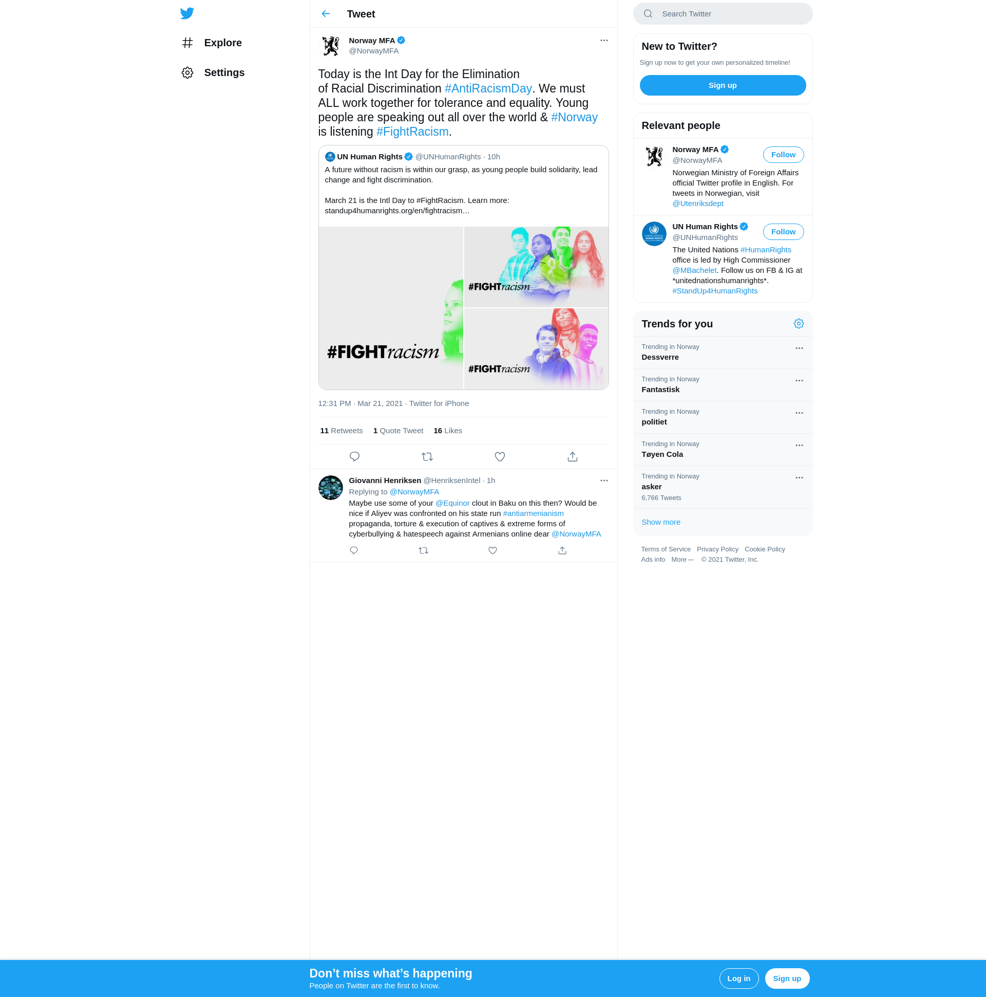 Today is the Int Day for the Elimination of Racial Discrimination #AntiRacismDay. We must ALL work together for tolerance and equality. Young people are speaking out all over the world & #Norway is listening #FightRacism.