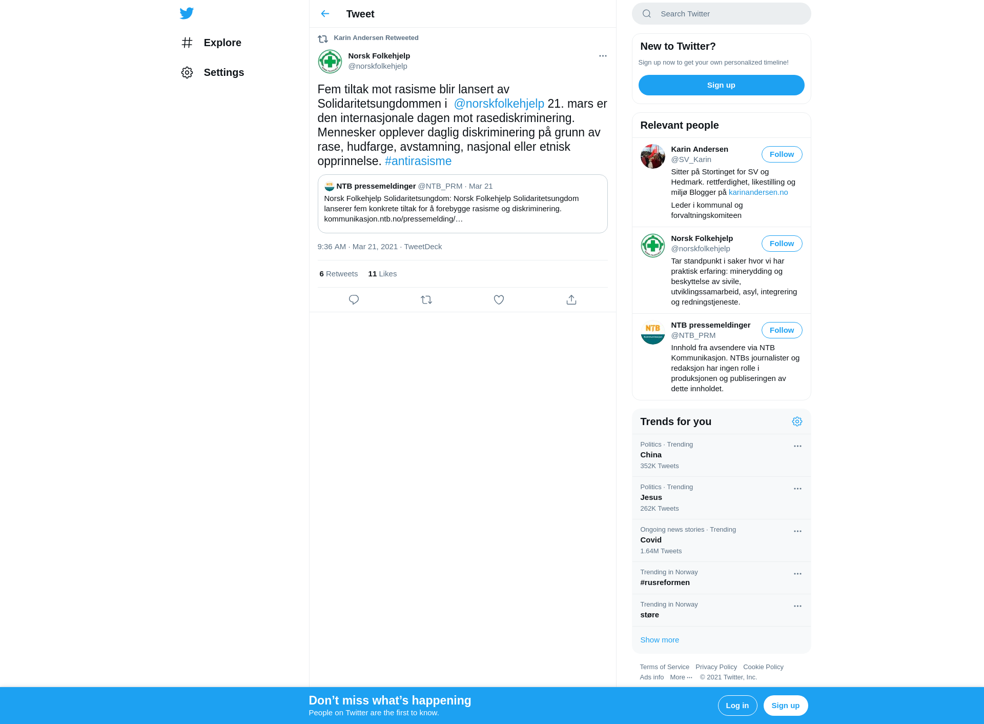 RT @norskfolkehjelp: Fem tiltak mot rasisme blir lansert av Solidaritetsungdommen i @norskfolkehjelp 21. mars er den internasjonale dagen mot rasediskriminering. Mennesker opplever daglig diskriminering på grunn av rase, hudfarge, avstamning, nasjonal eller etnisk opprinnelse. #antirasisme