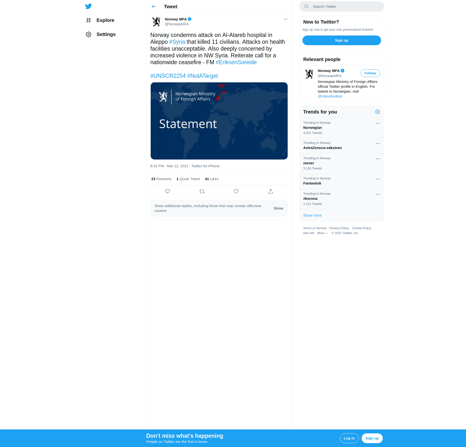 Norway condemns attack on Al-Atareb hospital in Aleppo #Syria that killed 11 civilians. Attacks on health facilities unacceptable. Also deeply concerned by increased violence in NW Syria. Reiterate call for a nationwide ceasefire - FM #EriksenSoreide