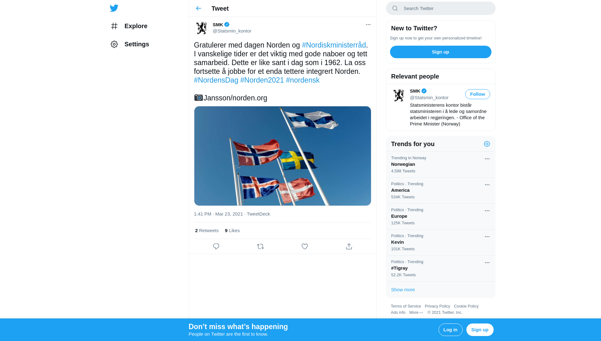 Gratulerer med dagen Norden og #Nordiskministerråd. I vanskelige tider er det viktig med gode naboer og tett samarbeid. Dette er like sant i dag som i 1962. La oss fortsette å jobbe for et enda tettere integrert Norden. #NordensDag #Norden2021 #nordensk
