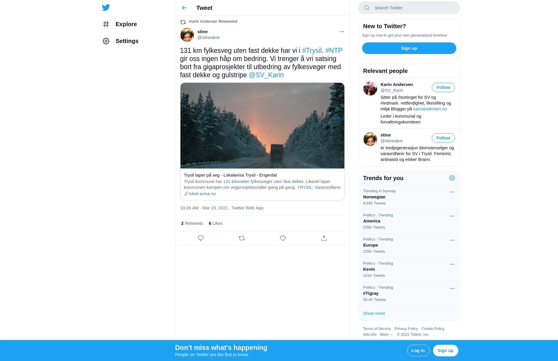 RT @stineakre: 131 km fylkesveg uten fast dekke har vi i #Trysil. #NTP gir oss ingen håp om bedring. Vi trenger å vri satsing bort fra gigaprosjekter til utbedring av fylkesveger med fast dekke og gulstripe @SV_Karin https://t.co/IARbr4PTwH