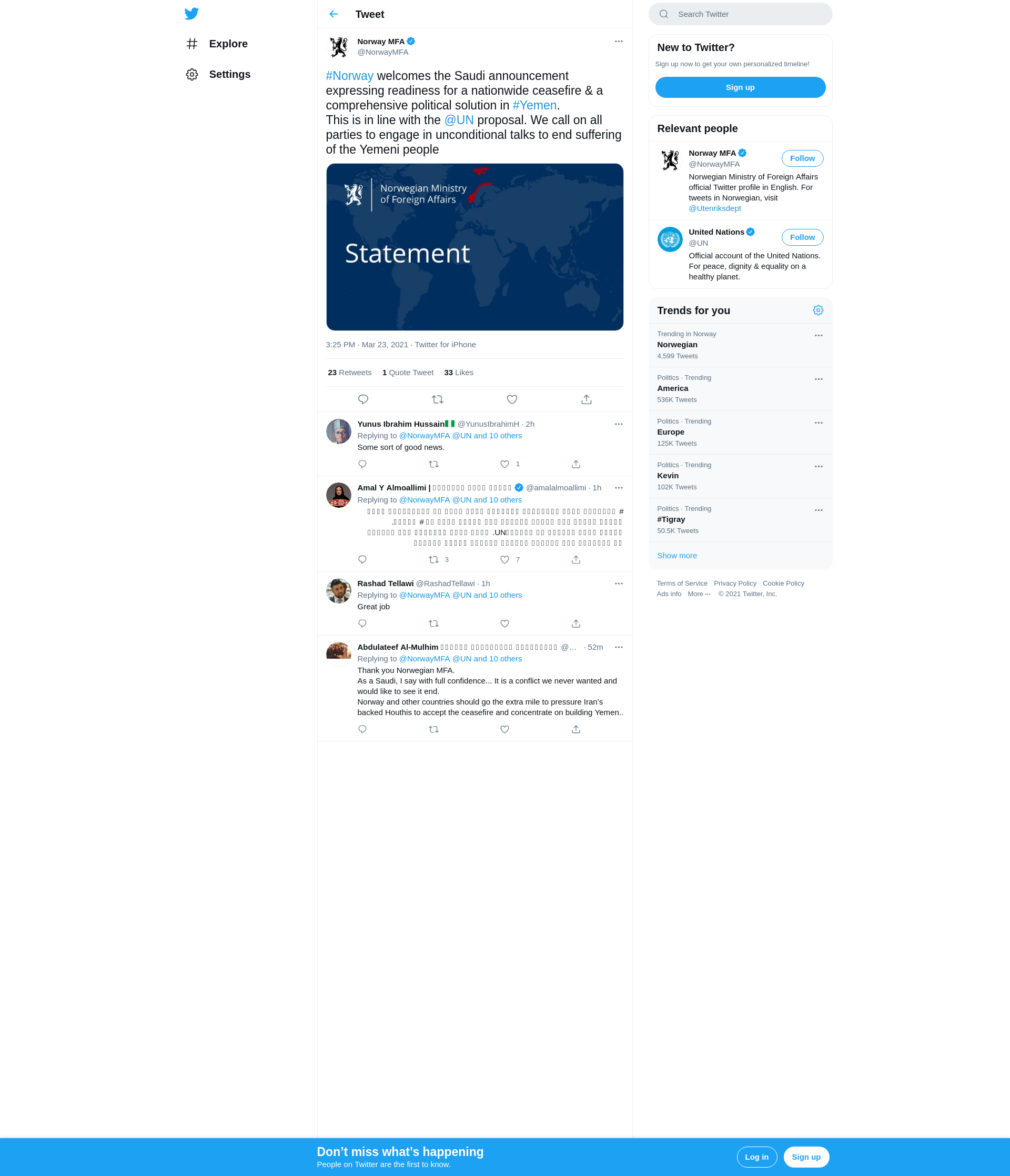 #Norway welcomes the Saudi announcement expressing readiness for a nationwide ceasefire & a comprehensive political solution in #Yemen.