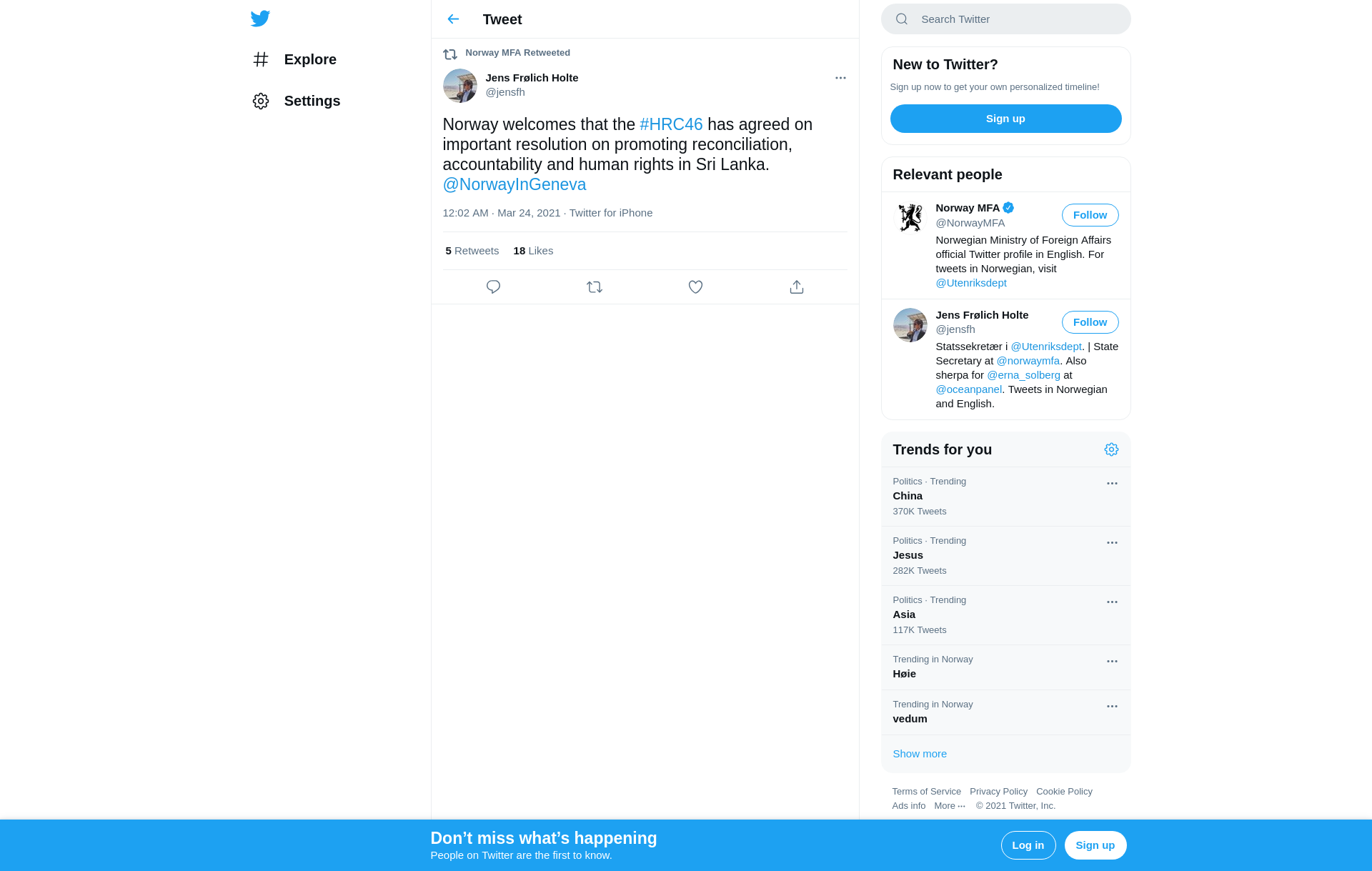 RT @jensfh: Norway welcomes that the #HRC46 has agreed on important resolution on promoting reconciliation, accountability and human rights in Sri Lanka. @NorwayInGeneva