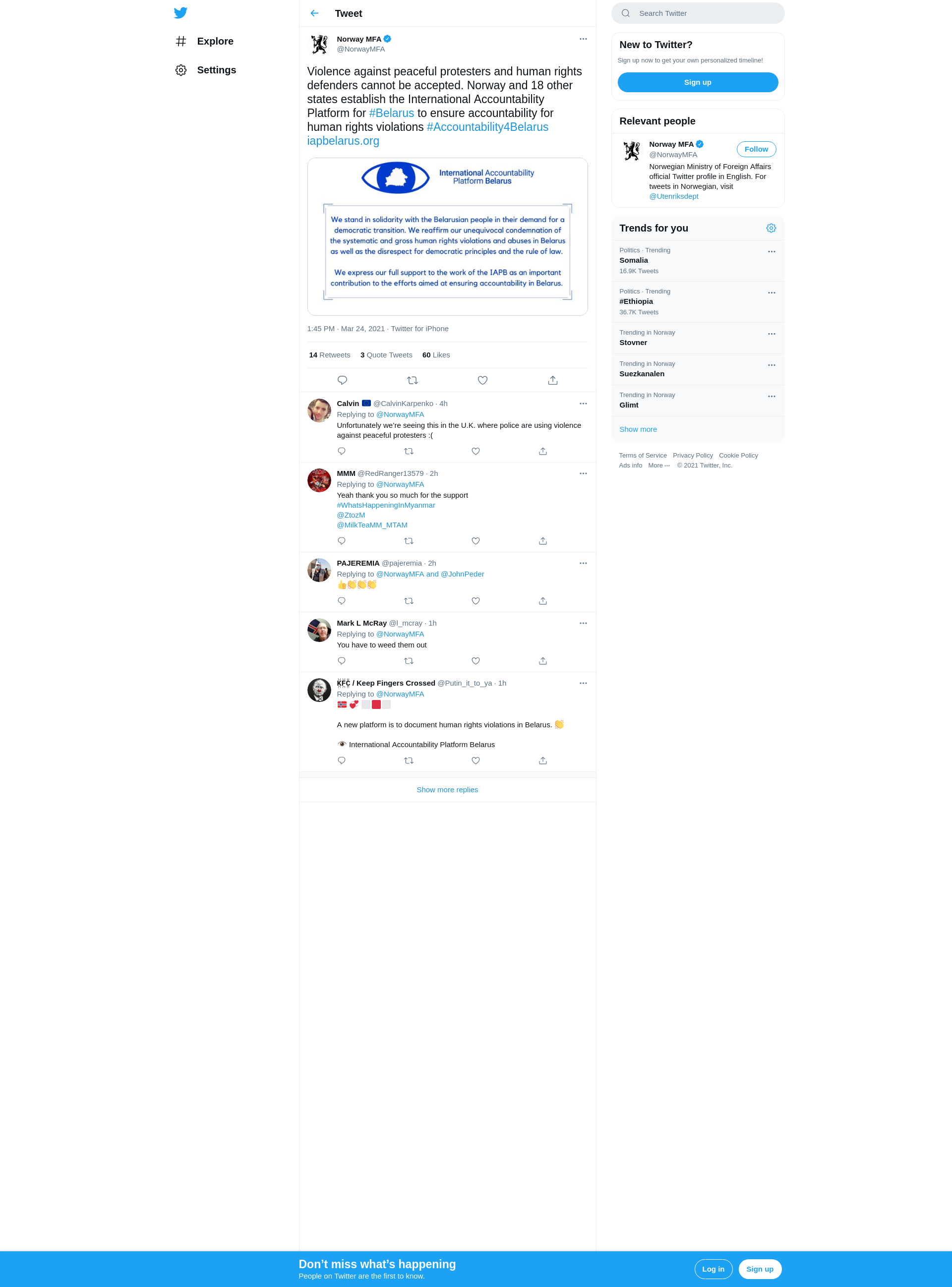 Violence against peaceful protesters and human rights defenders cannot be accepted. Norway and 18 other states establish the International Accountability Platform for #Belarus to ensure accountability for human rights violations #Accountability4Belarus https://t.co/5eZsGGZLlv https://t.co/PwAOfM2qsq