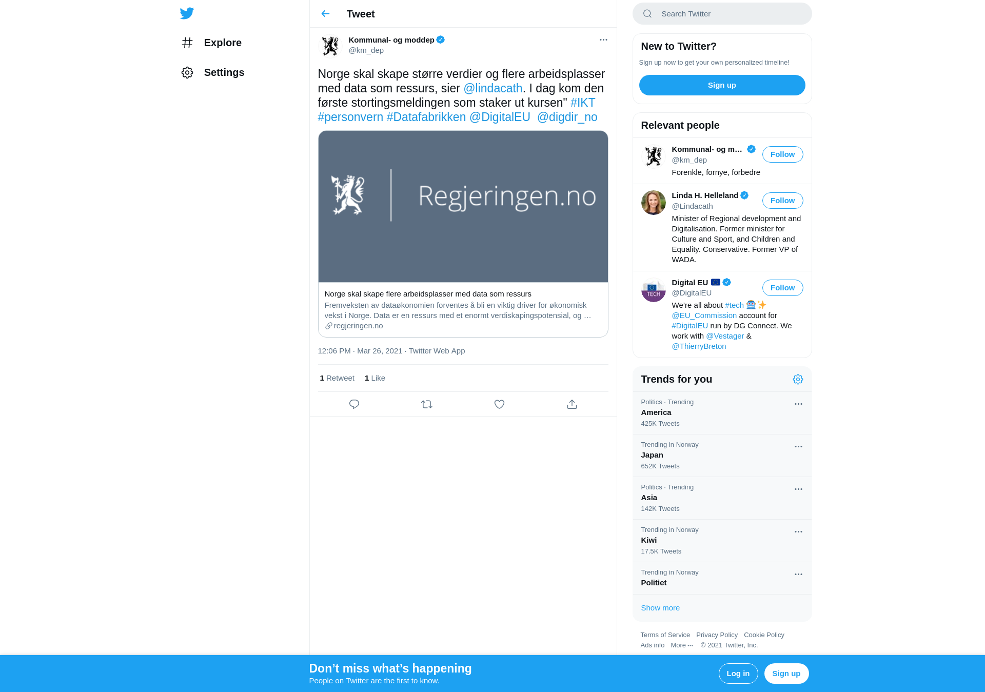 Fremveksten av dataøkonomien forventes å bli en viktig driver for økonomisk vekst i Norge. Data er en ressurs med et enormt verdiskapingspotensial, og offentlige og private virksomheter må derfor ikke la data ligge ubrukt. Regjeringen vil at Norge skal...