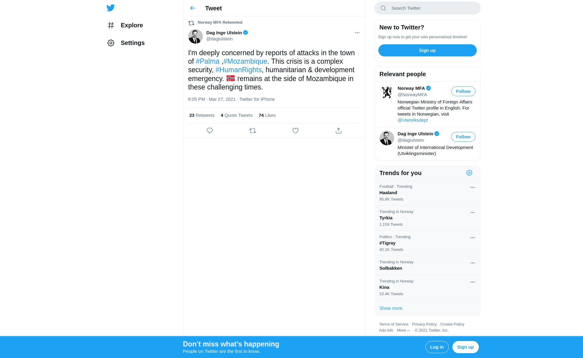 RT @dagiulstein: I'm deeply concerned by reports of attacks in the town of #Palma ,#Mozambique. This crisis is a complex security, #HumanRights, humanitarian & development emergency. 🇳🇴 remains at the side of Mozambique in these challenging times.