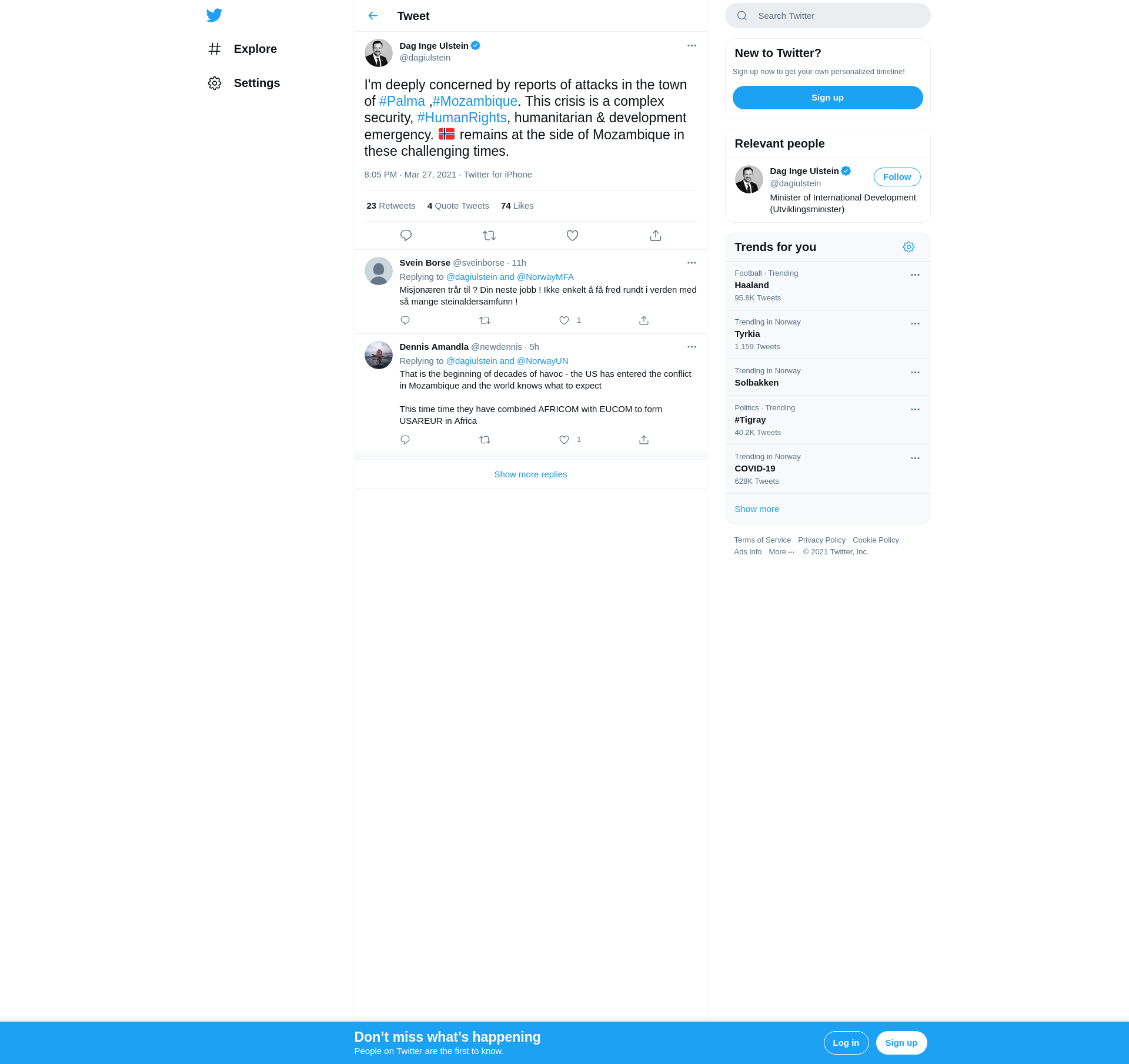 I'm deeply concerned by reports of attacks in the town of #Palma ,#Mozambique. This crisis is a complex security, #HumanRights, humanitarian & development emergency. 🇳🇴 remains at the side of Mozambique in these challenging times.