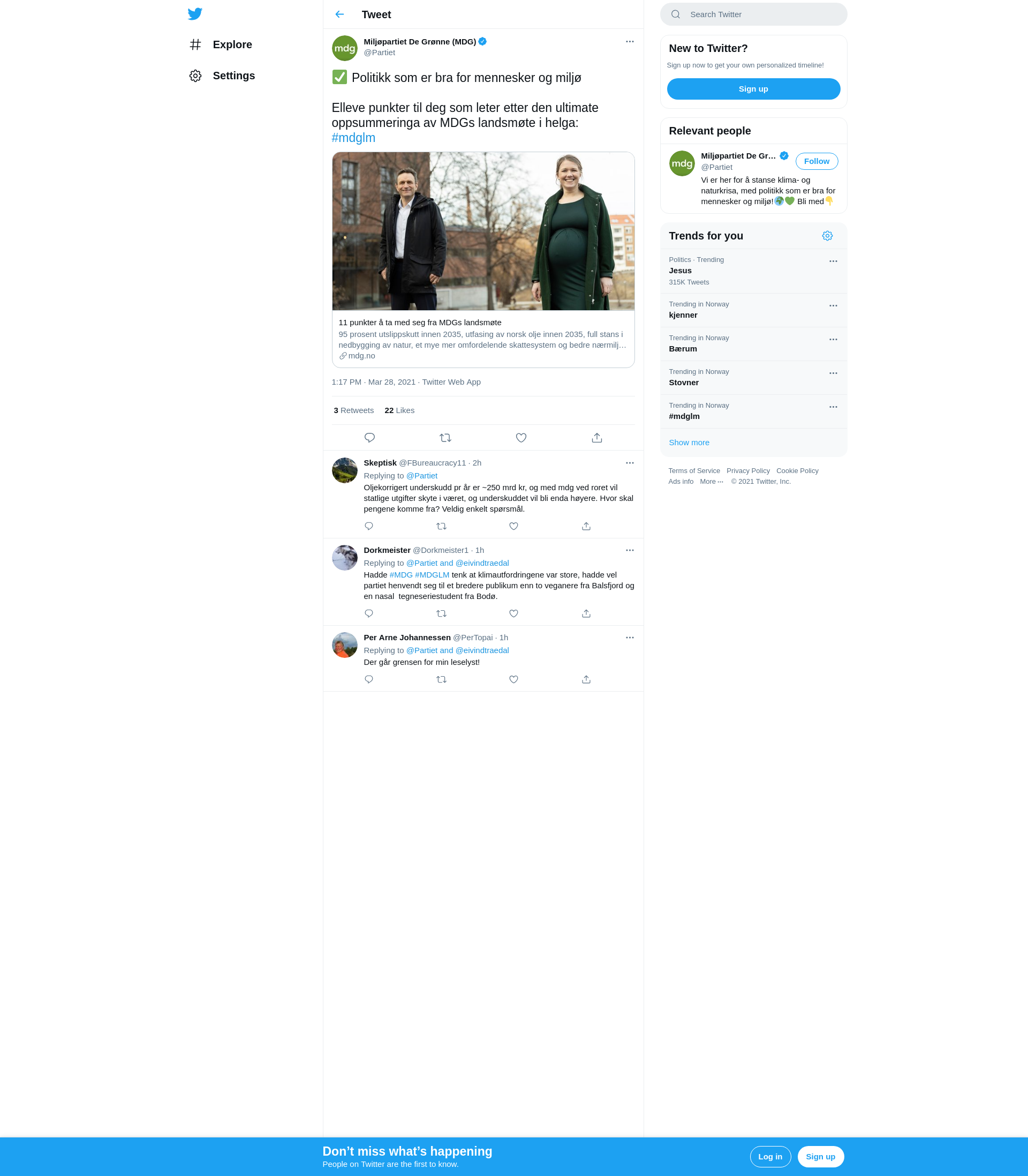 95 prosent utslippskutt innen 2035, utfasing av norsk olje innen 2035, full stans i nedbygging av natur, et mye mer omfordelende skattesystem og bedre nærmiljø for barn. Her er noe av det MDG går til valg på i 2021.